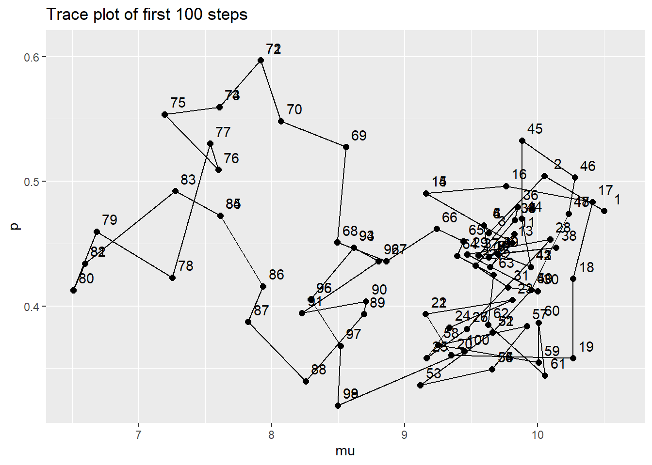 n_steps = 11000 delta = c(0.4, 0.05) # mu, p theta = data.frame(mu = rep(NA, n_steps), p = rep(NA, n_steps)) theta[1, ] = c(10.5, 10 / 21) # initialize for (n in 2:n_steps){ current = theta[n - 1, ] proposed = current + rnorm(2, mean = 0, sd = delta) accept = min(1, pi_theta(proposed$mu, proposed$p) / pi_theta(current$mu, current$p)) accept_ind = sample(0:1, 1, prob = c(1 - accept, accept)) theta[n, ] = proposed * accept_ind + current * (1 - accept_ind) } # Trace plot of first 100 steps ggplot(theta[1:100, ] %>% mutate(label = 1:100), aes(mu, p)) + geom_path() + geom_point(size = 2) + geom_text(aes(label = label, x = mu + 0.1, y = p + 0.01)) + labs(title = "Trace plot of first 100 steps")