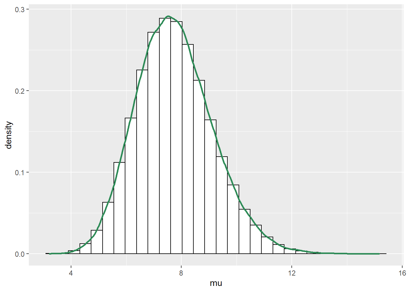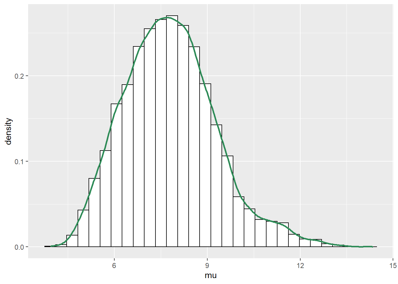 # Delete the first 1000 steps - we'll see why in the next chapter theta = theta[-(1:1000), ] ggplot(theta, aes(x = mu)) + geom_histogram(aes(y=..density..), color = "black", fill = "white") + geom_density(size = 1, color = "seagreen")