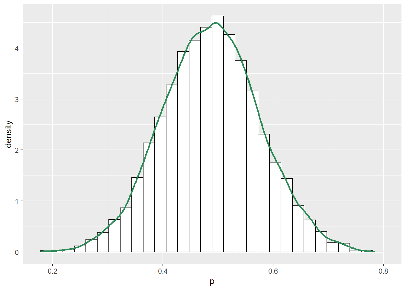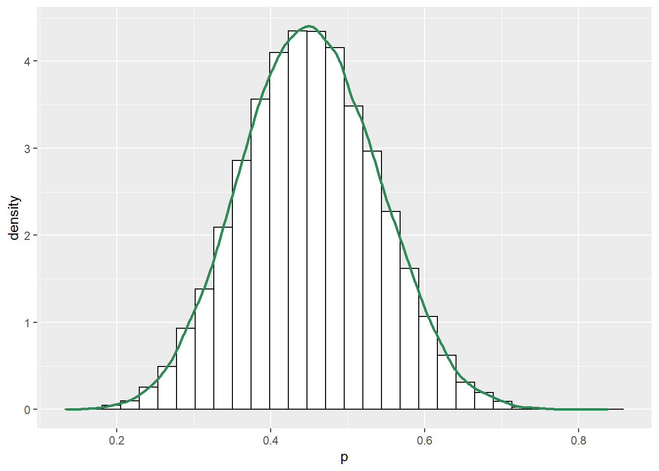 ggplot(theta, aes(x = p)) + geom_histogram(aes(y=..density..), color = "black", fill = "white") + geom_density(size = 1, color = "seagreen")
