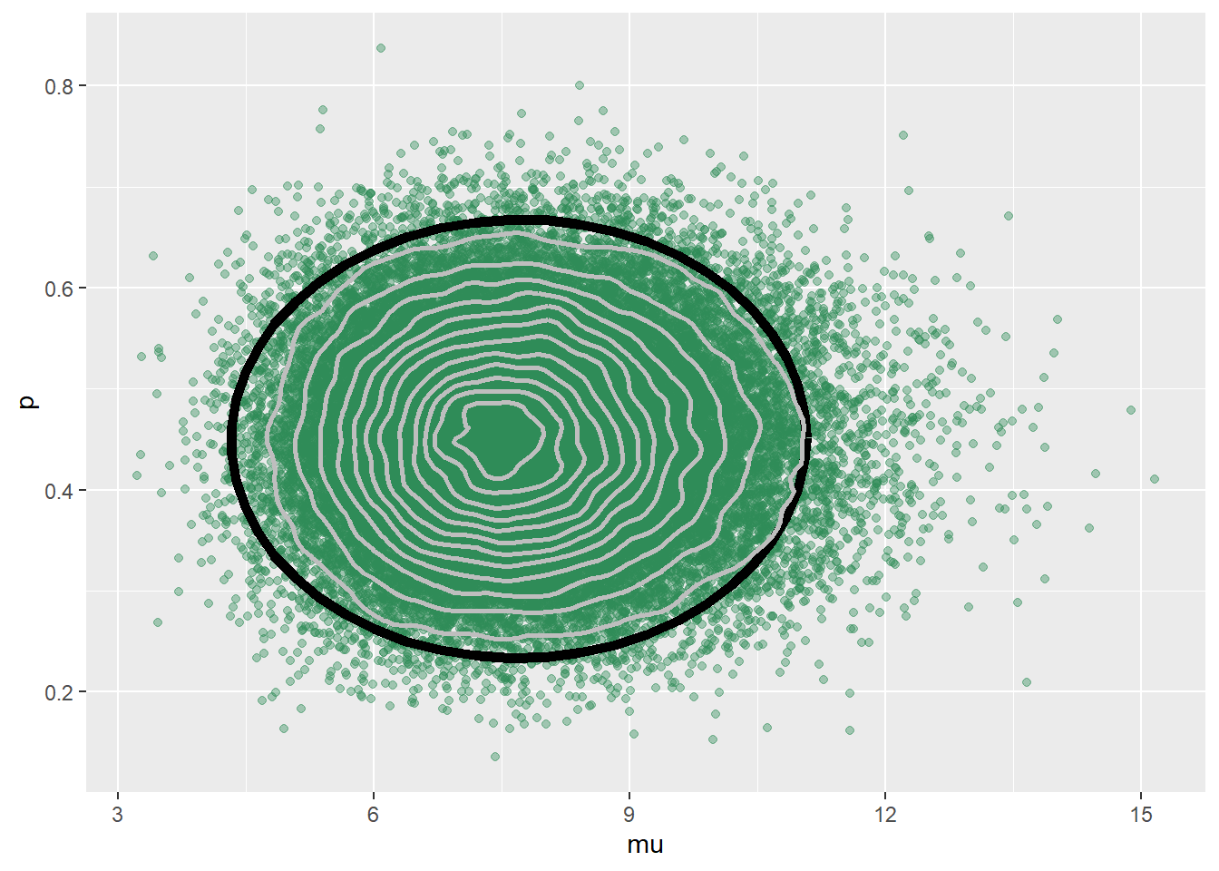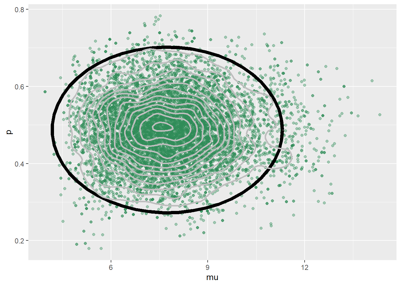 ggplot(theta, aes(mu, p)) + geom_point(color = "seagreen", alpha = 0.4) + stat_ellipse(level = 0.98, color = "black", size = 2) + stat_density_2d(color = "grey", size = 1) + geom_abline(intercept = 0, slope = 1)