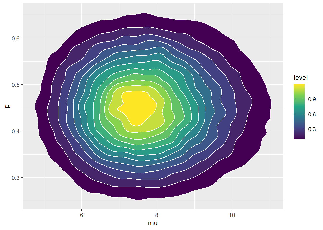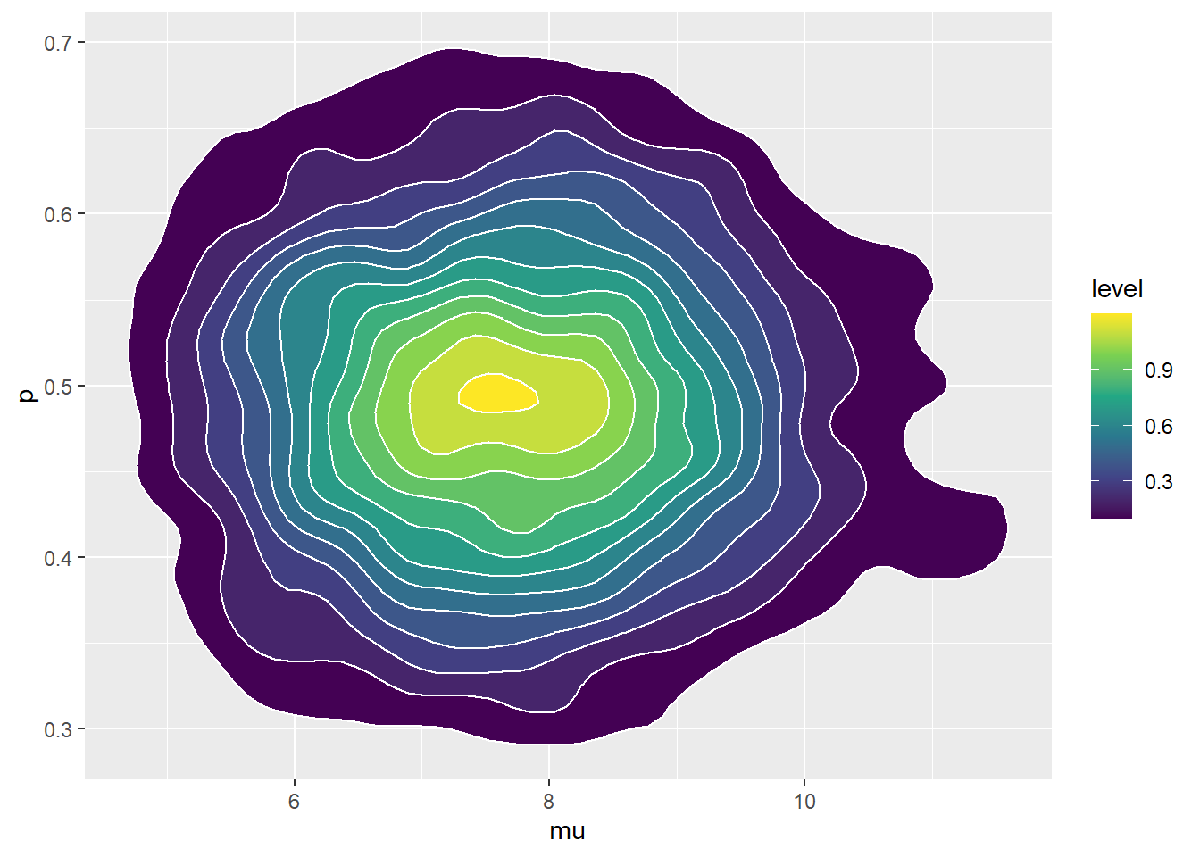 ggplot(theta, aes(mu, p)) + stat_density_2d(aes(fill = ..level..), geom = "polygon", color = "white") + scale_fill_viridis_c() + geom_abline(intercept = 0, slope = 1)