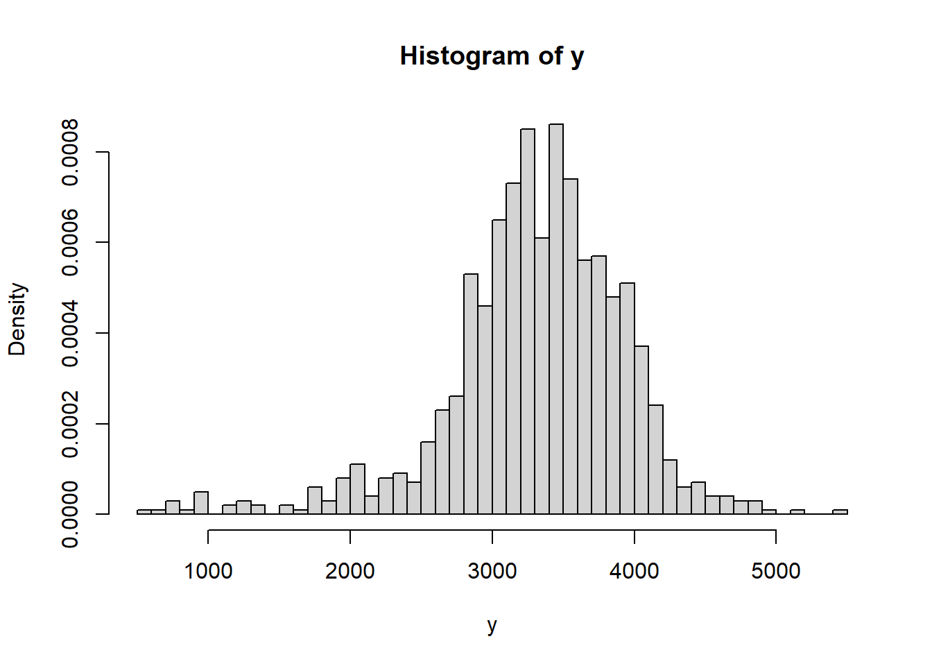data = read.csv("_data/birthweight.csv") y = data$birthweight hist(y, freq = FALSE, breaks = 50)