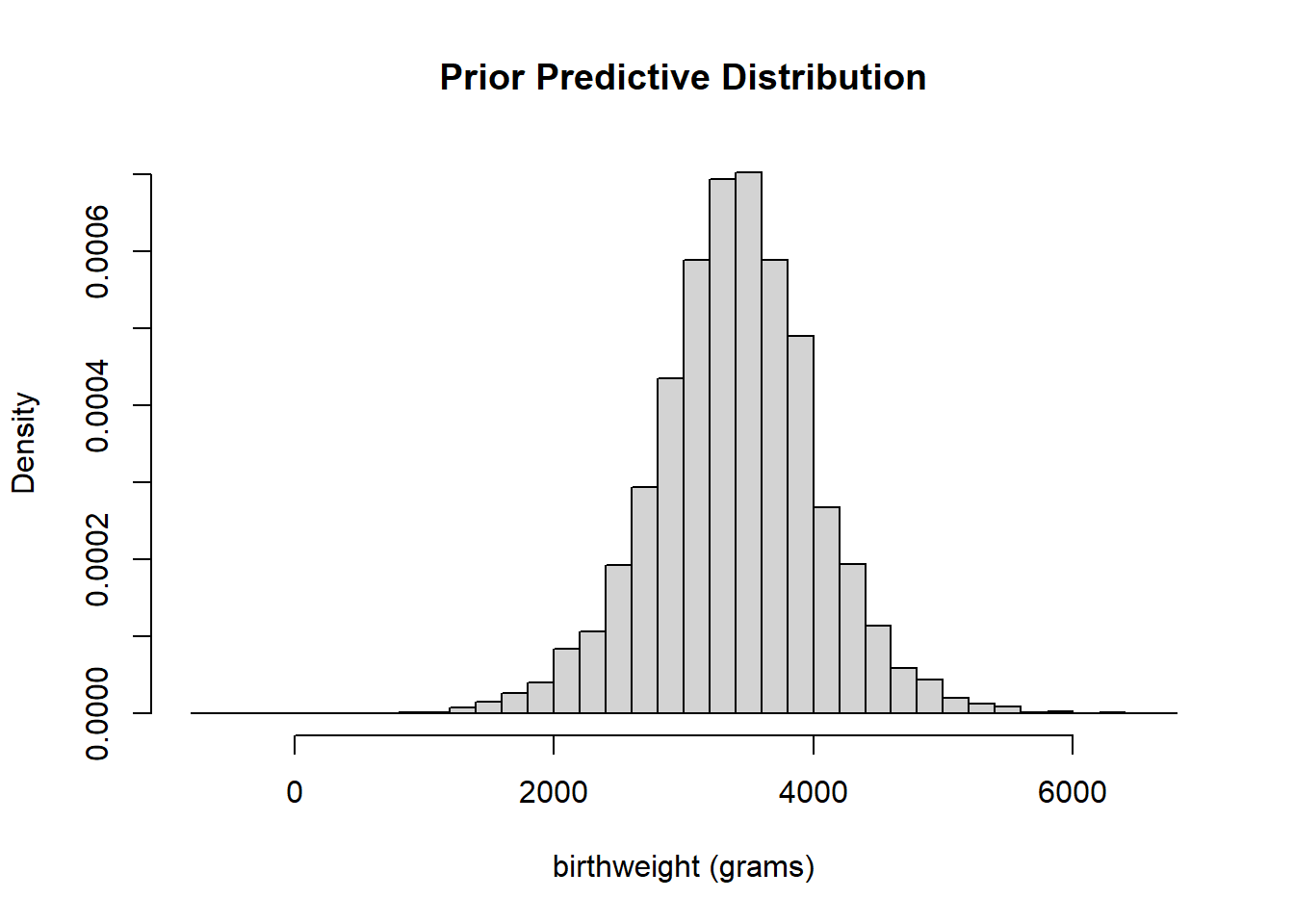 n_rep = 10000 mu_sim = rnorm(n_rep, 3400, sd = 100) sigma_sim = rgamma(n_rep, 600 ^ 2 / 200 ^ 2, 600 / 200 ^2) y_sim = rnorm(n_rep, mu_sim, sigma_sim) hist(y_sim, breaks = 50, freq = FALSE, main = "Prior Predictive Distribution", xlab = "birthweight (grams)")