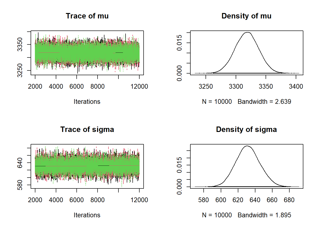 Nrep = 10000 Nchains = 3 # data # data has already been loaded in previous code # y is the full sample # n is the sample size # model model_string <- "model{ # Likelihood for (i in 1:n){ y[i] ~ dnorm(mu, 1 / sigma ^ 2) } # Prior mu ~ dnorm(3400, 1 / 100 ^ 2) sigma ~ dgamma(600 ^ 2 / 200 ^ 2, 600 / 200 ^2) }" # Compile the model dataList = list(y=y, n=n) model <- jags.model(textConnection(model_string), data=dataList, n.chains=Nchains)## Compiling model graph ## Resolving undeclared variables ## Allocating nodes ## Graph information: ## Observed stochastic nodes: 1000 ## Unobserved stochastic nodes: 2 ## Total graph size: 1017 ## ## Initializing modelupdate(model, 1000, progress.bar="none") posterior_sample <- coda.samples(model, variable.names=c("mu", "sigma"), n.iter=Nrep, progress.bar="none") # Summarize and check diagnostics summary(posterior_sample)## ## Iterations = 2001:12000 ## Thinning interval = 1 ## Number of chains = 3 ## Sample size per chain = 10000 ## ## 1. Empirical mean and standard deviation for each variable, ## plus standard error of the mean: ## ## Mean SD Naive SE Time-series SE ## mu 3318 19.6 0.1130 0.113 ## sigma 632 14.1 0.0813 0.102 ## ## 2. Quantiles for each variable: ## ## 2.5% 25% 50% 75% 97.5% ## mu 3280 3305 3318 3331 3356 ## sigma 605 622 631 641 660plot(posterior_sample)