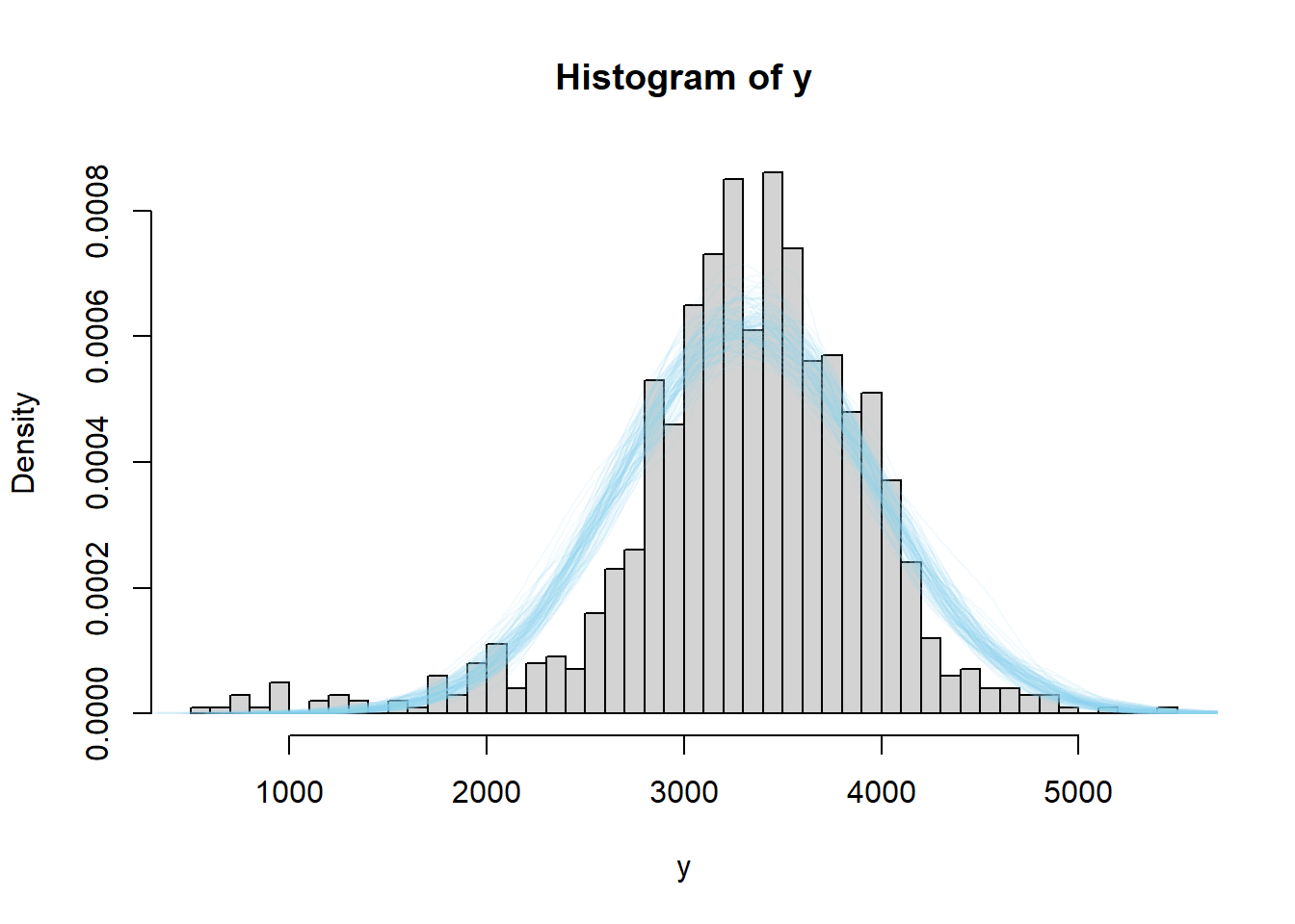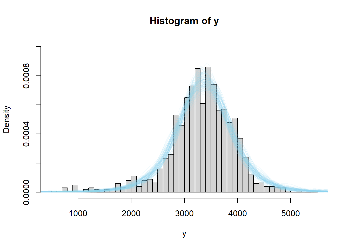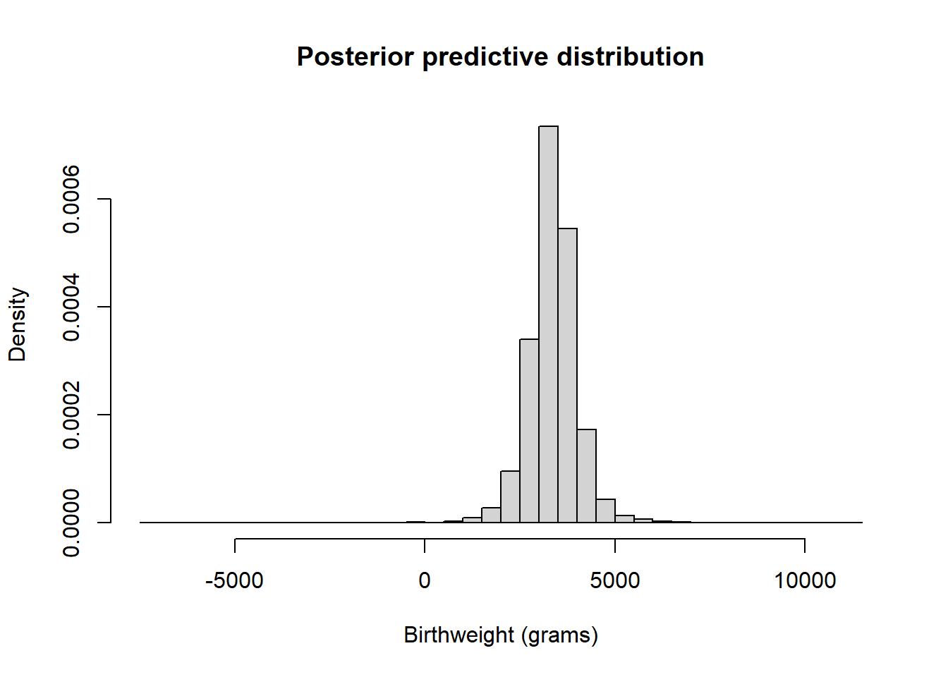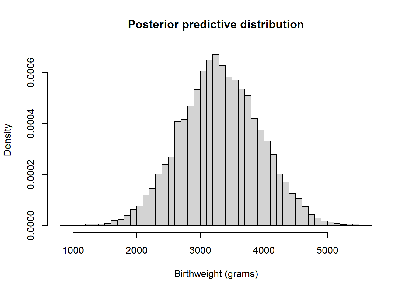 theta_sim = data.frame(as.matrix(posterior_sample)) y_sim = rnorm(Nrep, theta_sim$mu, theta_sim$sigma) hist(y_sim, freq = FALSE, breaks = 50, xlab = "Birthweight (grams)", main = "Posterior predictive distribution")