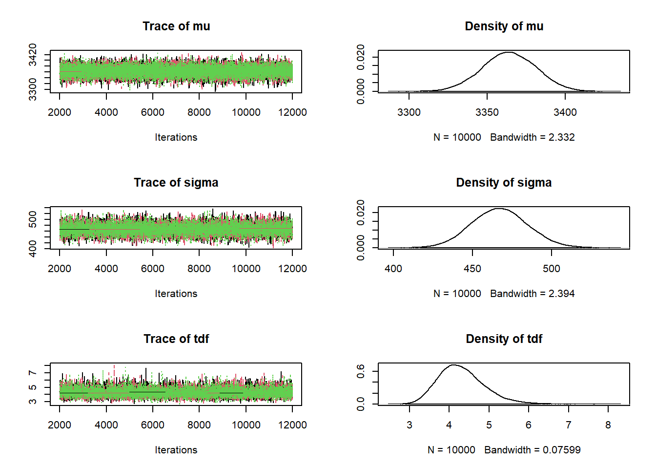 Nrep = 10000 Nchains = 3 # data # data has already been loaded in previous code # y is the full sample # n is the sample size # model model_string <- "model{ # Likelihood for (i in 1:n){ y[i] ~ dt(mu, 1 / sigma ^ 2, tdf) } # Prior mu ~ dnorm(3400, 1 / 100 ^ 2) sigma ~ dgamma(600 ^ 2 / 200 ^ 2, 600 / 200 ^ 2) tdf <- 1 + tdf0 tdf0 ~ dexp(1 / 29) }" # Compile the model dataList = list(y=y, n=n) model <- jags.model(textConnection(model_string), data=dataList, n.chains=Nchains)## Compiling model graph ## Resolving undeclared variables ## Allocating nodes ## Graph information: ## Observed stochastic nodes: 1000 ## Unobserved stochastic nodes: 3 ## Total graph size: 1021 ## ## Initializing modelupdate(model, 1000, progress.bar="none") posterior_sample <- coda.samples(model, variable.names=c("mu", "sigma", "tdf"), n.iter=Nrep, progress.bar="none") # Summarize and check diagnostics summary(posterior_sample)## ## Iterations = 2001:12000 ## Thinning interval = 1 ## Number of chains = 3 ## Sample size per chain = 10000 ## ## 1. Empirical mean and standard deviation for each variable, ## plus standard error of the mean: ## ## Mean SD Naive SE Time-series SE ## mu 3363.86 17.292 0.09983 0.12766 ## sigma 467.18 17.753 0.10250 0.20309 ## tdf 4.31 0.583 0.00336 0.00678 ## ## 2. Quantiles for each variable: ## ## 2.5% 25% 50% 75% 97.5% ## mu 3329.69 3352.3 3363.82 3375.72 3397.52 ## sigma 433.07 455.0 466.99 478.95 502.72 ## tdf 3.34 3.9 4.25 4.65 5.61plot(posterior_sample)