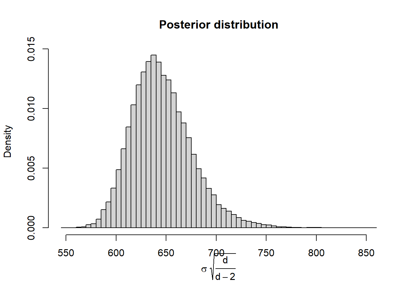 hist(theta_sim$sigma * sqrt(theta_sim$tdf / (theta_sim$tdf - 2)), freq = FALSE, breaks = 50, main = "Posterior distribution", xlab = expression(paste(sigma, " ", sqrt(frac(d, d-2)))))