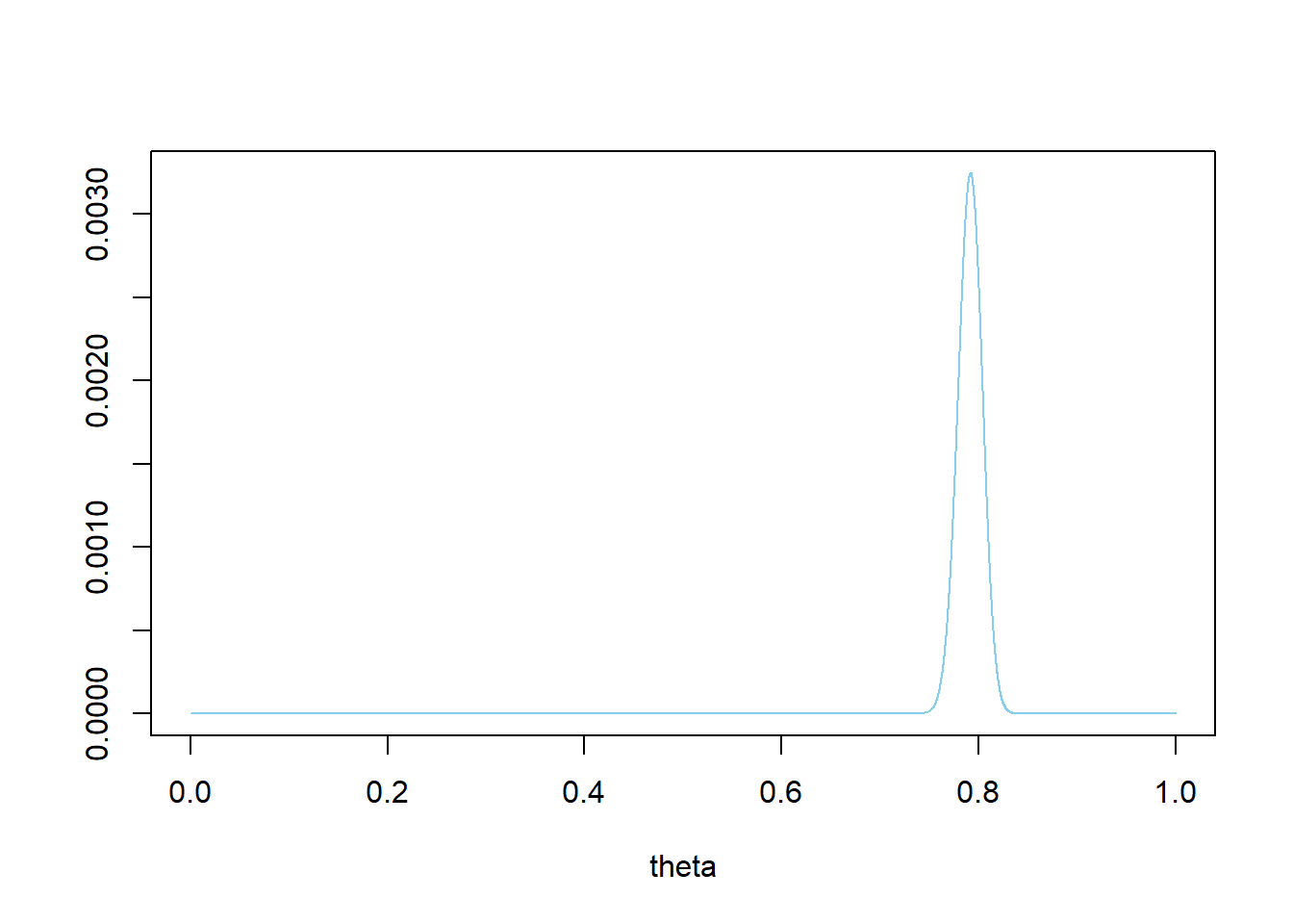 # prior theta = seq(0, 1, 0.0001) prior = theta ^ 864 * (1 - theta) ^ 227 prior = prior / sum(prior) ylim = c(0, max(prior)) plot(theta, prior, type='l', xlim=c(0, 1), ylim=ylim, col="skyblue", xlab='theta', ylab='')
