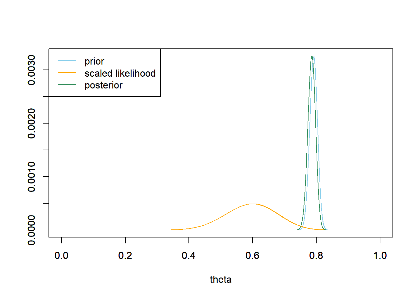 # prior mean prior_ev = sum(theta * prior) prior_ev## [1] 0.7914# prior variance prior_var = sum(theta ^ 2 * prior) - prior_ev ^ 2 # prior sd sqrt(prior_var)## [1] 0.01228# prior 98% credible interval prior_cdf = cumsum(prior) c(theta[max(which(prior_cdf <= 0.01))], theta[min(which(prior_cdf >= 0.99))])## [1] 0.7620 0.8192Our posterior distribution has barely changed from the prior. Even though the sample proportion is 21/35 = 0.61, our prior beliefs were so strong (represented by the small prior SD) that a sample of size 35 isn’t very convincing.