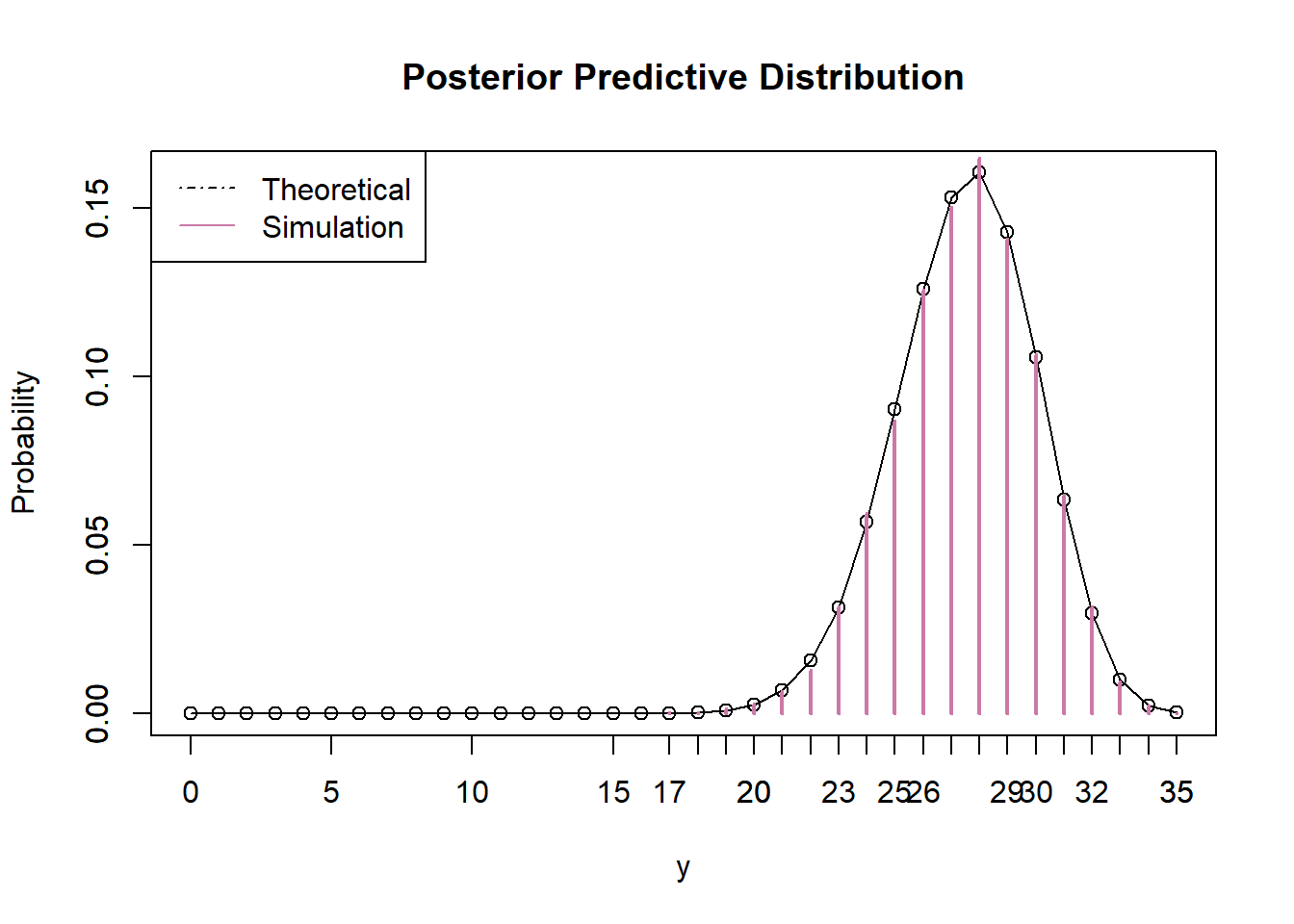 n = 35 # Predictive simulation theta_sim = sample(theta, n_sim, replace = TRUE, prob = posterior) y_sim = rbinom(n_sim, n, theta_sim) # Predictive distribution y_predict = 0:n py_predict = rep(NA, length(y_predict)) for (i in 1:length(y_predict)) { py_predict[i] = sum(dbinom(y_predict[i], n, theta) * posterior) # posterior } # Prediction interval sum(py_predict[y_predict <= y])## [1] 0.01105