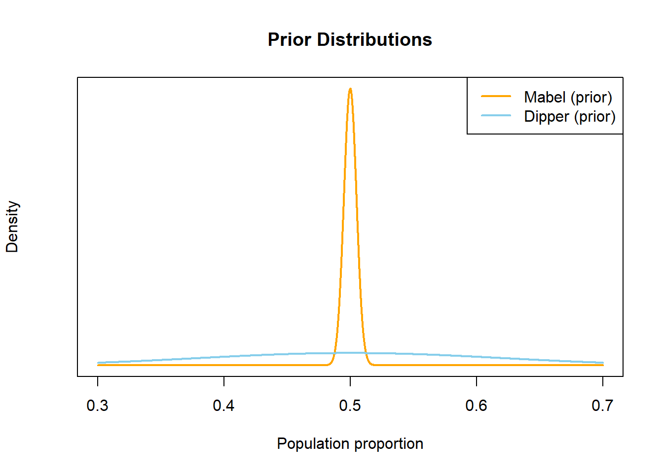 1 - pbinom(8, 10, 0.5)). Rogelio’s set up would be similar and would yield the same p-value. So a strict frequentist would be equally convinced of the two claims. - Prior to observing data, we are probably more skeptical of Xiomara’s claim than Rogelio’s. Since coin flips are unpredictable, we would have a strong prior belief that \(\theta_X\) is close to 0.5 (what it would be if she were just guessing). Our prior for \(\theta_X\) would have a mean of 0.5 and a small prior SD, to reflect that only values close to 0.5 seem plausible. Therefore, it would require a lot of evidence to sway our prior beliefs.