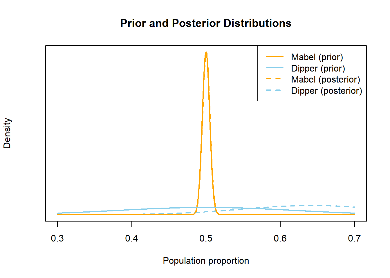 On the other hand, we might be familiar with people who can tell the difference between Coke and Pepsi; maybe we even can ourselves. Our prior for \(\theta_R\) would have a smaller prior SD than that of \(\theta_X\) to allow for a wider range of plausible values. We might even have a prior mean for \(\theta_R\) above 0.5 if we have experience with a lot of people who can tell the difference between Coke and Pepsi. Given the sample data, our posterior probability that \(\theta_R>0.5\) would be larger than the posterior probability that \(\theta_X > 0.5\), and we would be more convinced by Rogelio’s claim than by Xiomara’s.