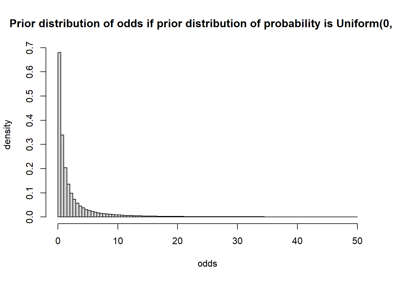 theta = rbeta(1000000, 1, 1) odds = theta / (1 - theta) hist(odds[odds<50], breaks = 100, xlab = "odds", freq = FALSE, ylab = "density", main = "Prior distribution of odds if prior distribution of probability is Uniform(0, 1)")