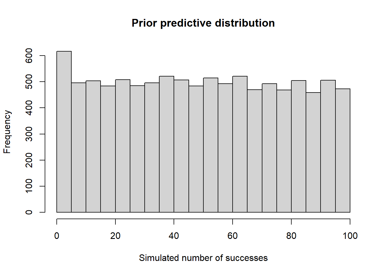 theta_sim = runif(10000) y_sim = rbinom(10000, 100, theta_sim) hist(y_sim, xlab = "Simulated number of successes", main = "Prior predictive distribution")