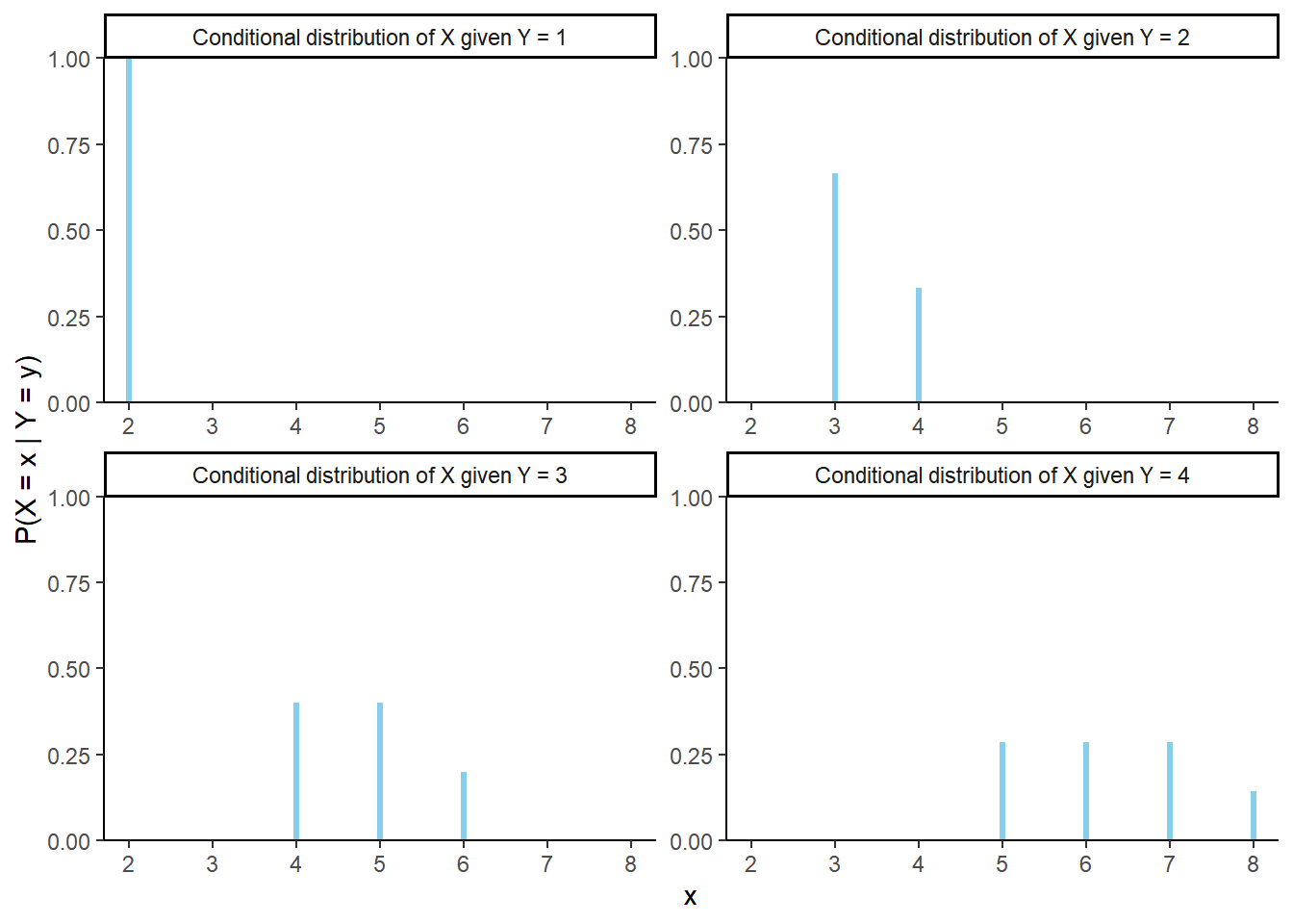 - Compute \(p_{X|Y}(6|4) = \text{P}(X=6|Y=4)\).