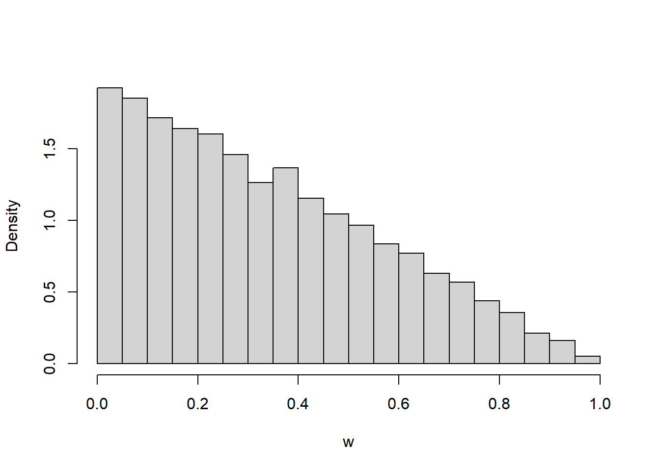 - Coding required. Code and run a simulation to approximate the distribution of \(W\). Does the histogram reasonably match up with the pdf? Then use the simulation results to approximate \(\text{P}(W < 0.25)\).
