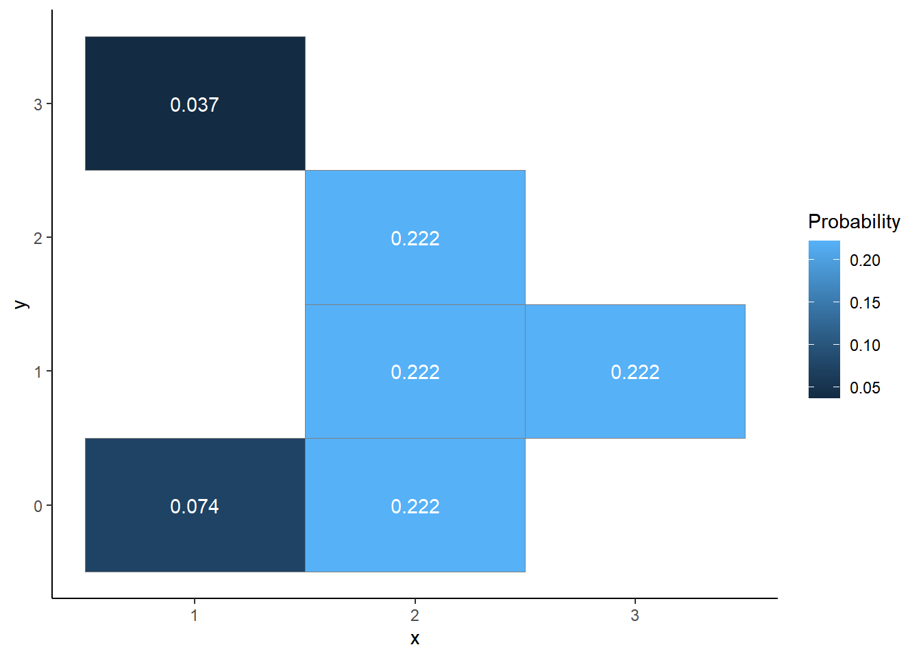 \(y\) \(x\) 0 1 2 3 Total 1 2/27 0 0 1/27 3/27 2 6/27 6/27 6/27 0 18/27 3 0 6/27 0 0 6/27 Total 8/27 12/27 6/27 1/27 1 Make a tile plot with color or shading representing probability; see below.