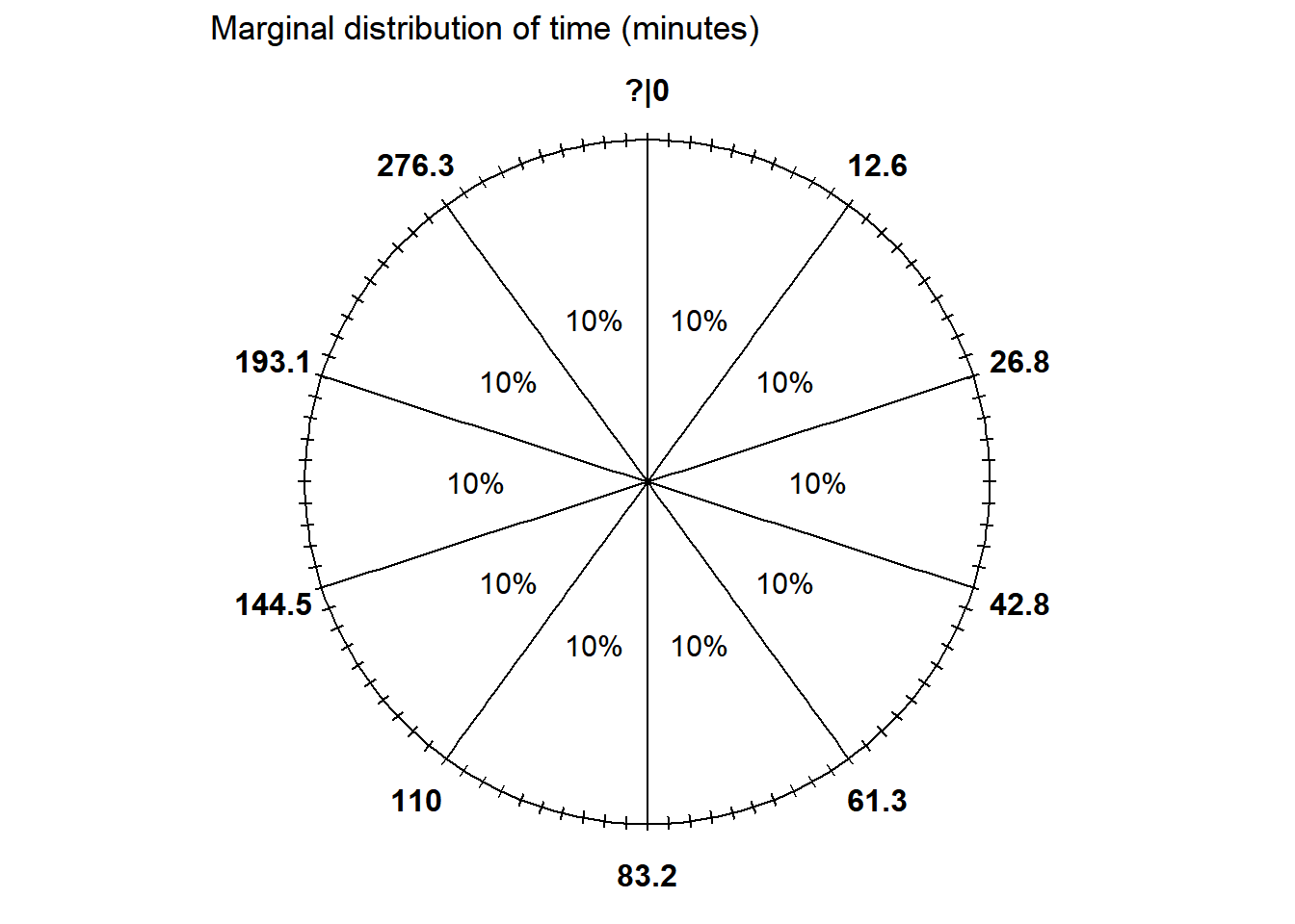 - The 25th percentile of \(Q_W(0.25) = 1 - \sqrt{1-0.25} = 0.134\) hours (8 minutes) would go at the 3 o’clock point.