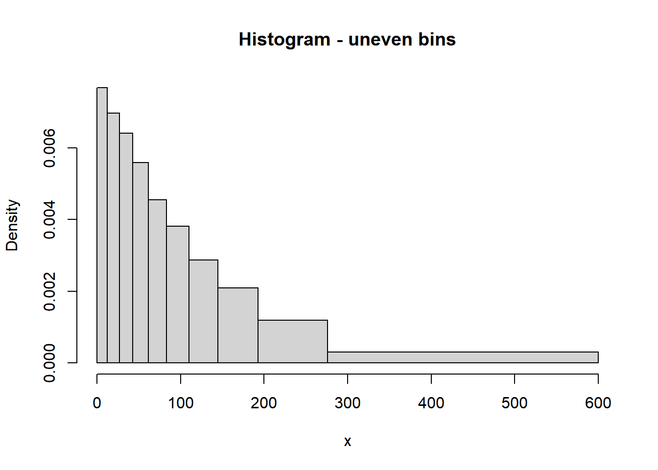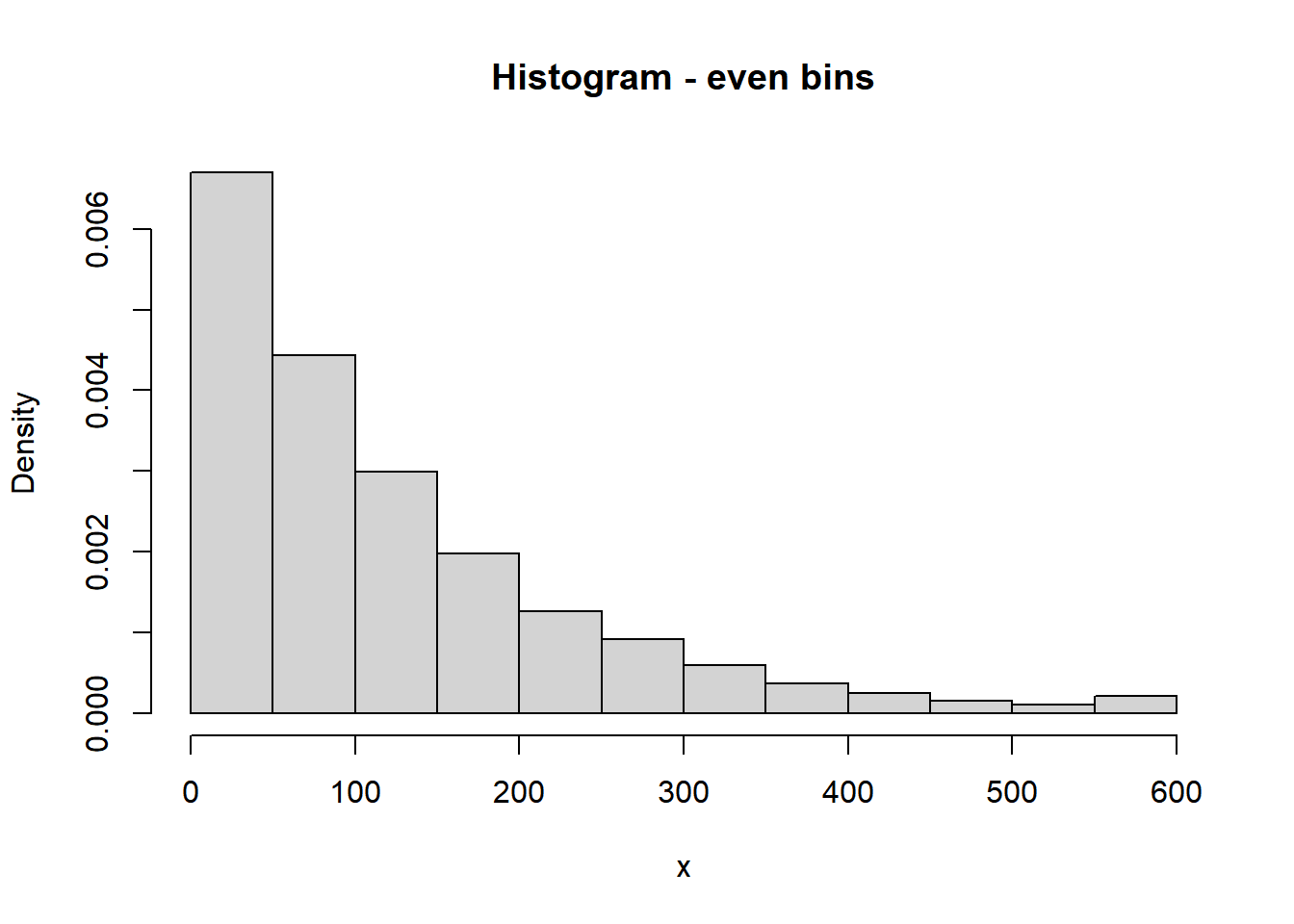 - We always end with a histogram with even bins, but sometimes it helps to start sketching a histogram with unever bins. We know that 10% of the values are between 0 and 12.6, 10% are between 12.6 and 26.8, 10% are between 26.8 and 42.8, etc. So if we split the bins of the histogram based on these percentiles, each bin would correspond to a relative frequency of 10%. HOWEVER, AREA in a histogram represents relative frequency. So each of the bins would have the same area, but they are unequally spaced, so they would not have the same height. For example, the first bin has area of 10% over a base of (0, 12.6), while the 80-90 percentile bin has area 10% spread over the interval (193.1, 276.3), so the bar for (193.1, 276.3) will have a smaller height than the bar for (0, 12.6). Sketching a histogram with these unevenly spaced bins first gives an idea of the shape; then you can sketch a histogram with a similar shape but equally spaced bins. We can see that density is highest near 0 and decreases as \(x\) increases; notice the stretching and shrinking on the spinner. (The highest percentile is the 90th, so we don’t know what the upper bound is that almost all values fall below.)