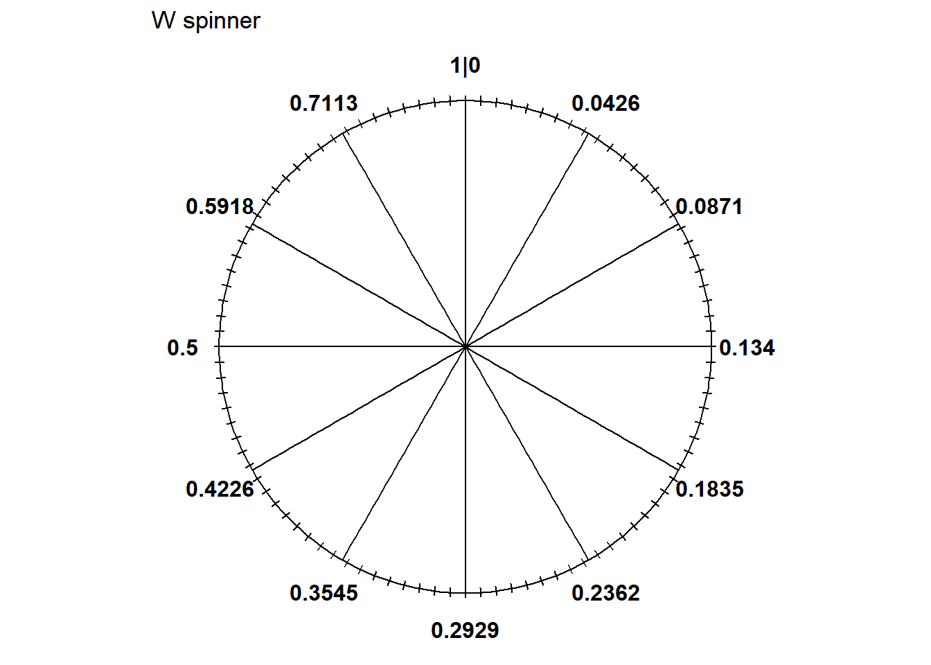 - Notice that the values around the spinner are unequally spaced. The density of \(W\) is higher near 0 so intervals near 0 are stretched out; the density of \(W\) is lower near 1 so intervals near 1 are shrunk.
