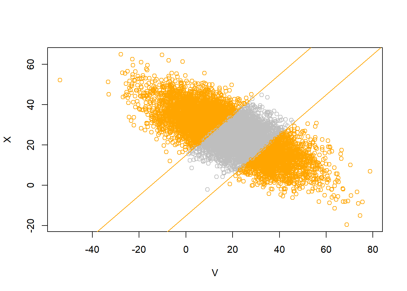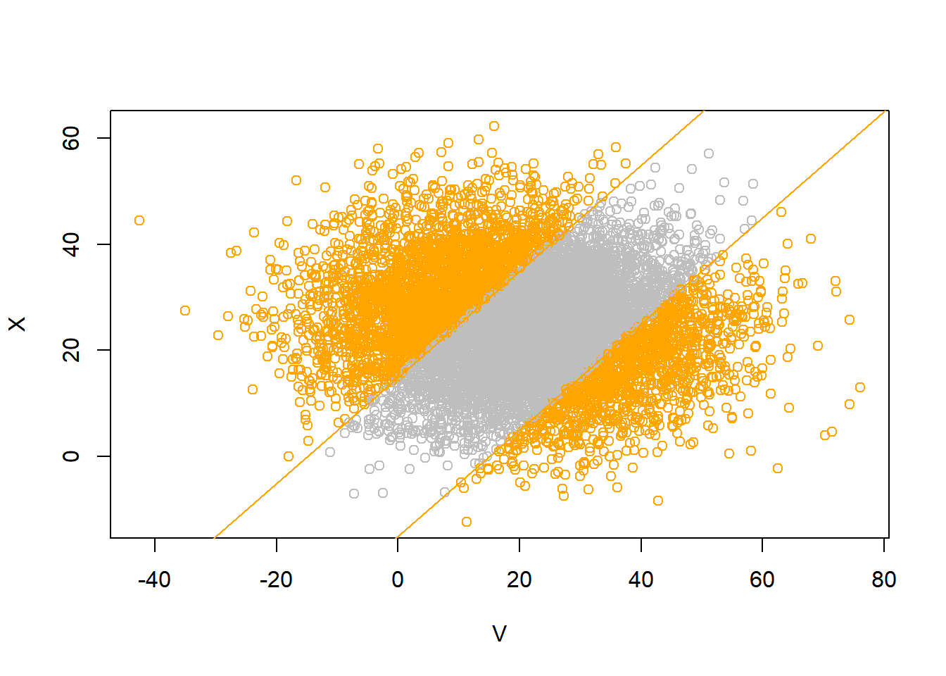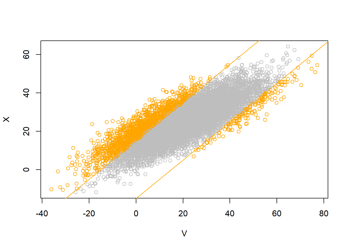 plot(V, X, col = ifelse(abs(V - X) > 15, "orange", "gray"))
