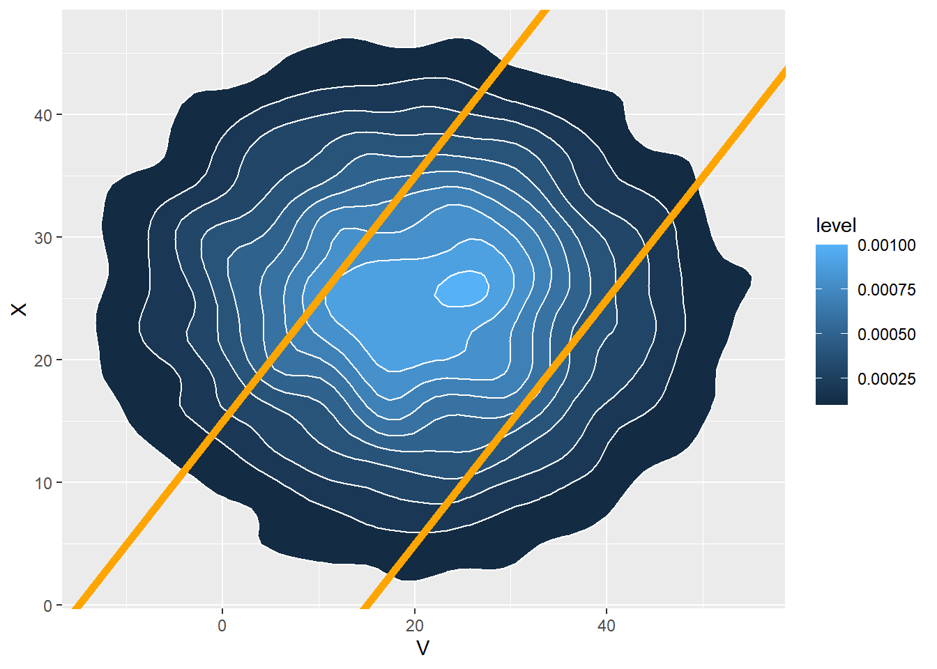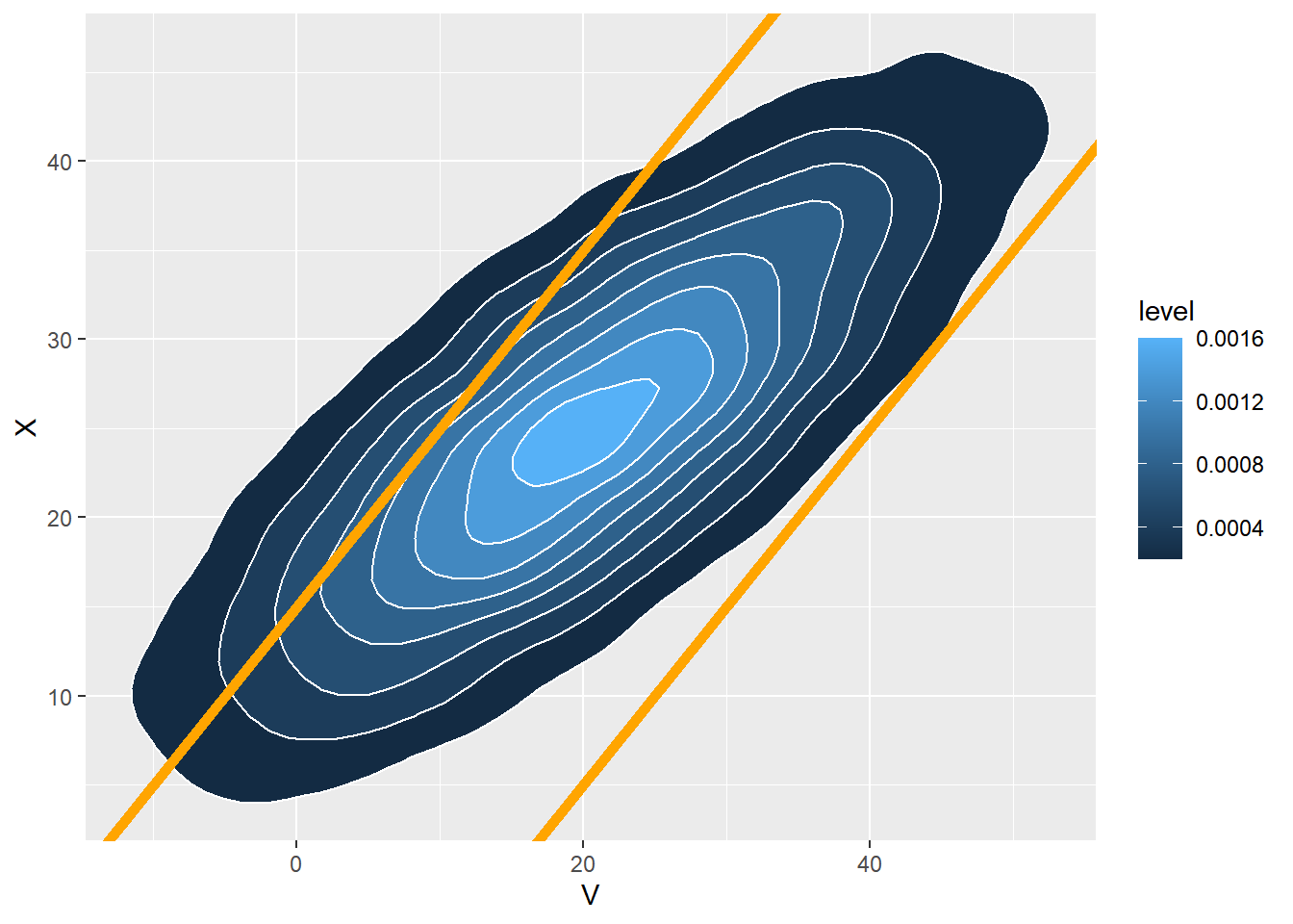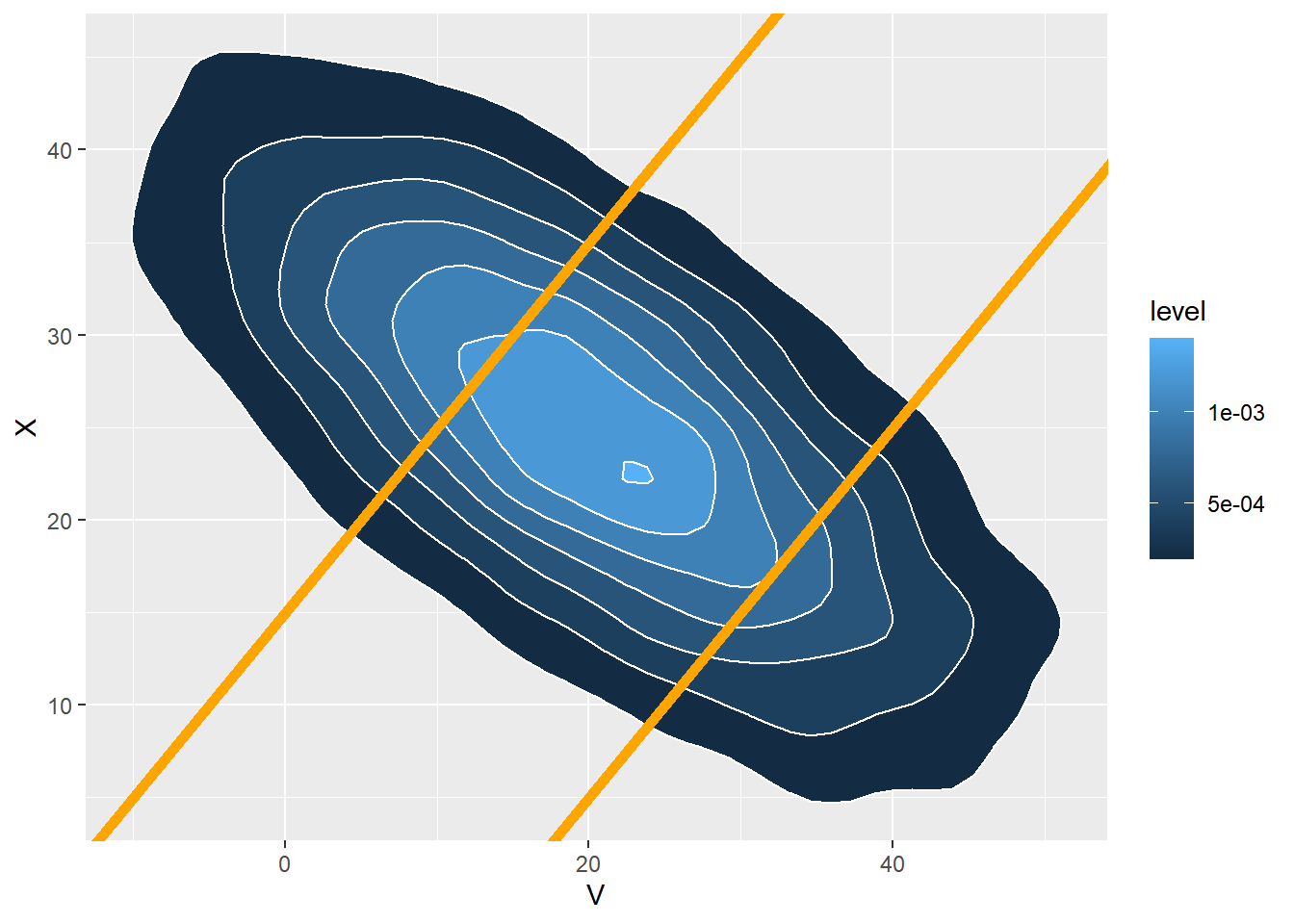 X = rnorm(N_rep, 25 + 10 * 0.8 * (V - 20) / 15, 10 * sqrt(1 - 0.8 ^ 2))