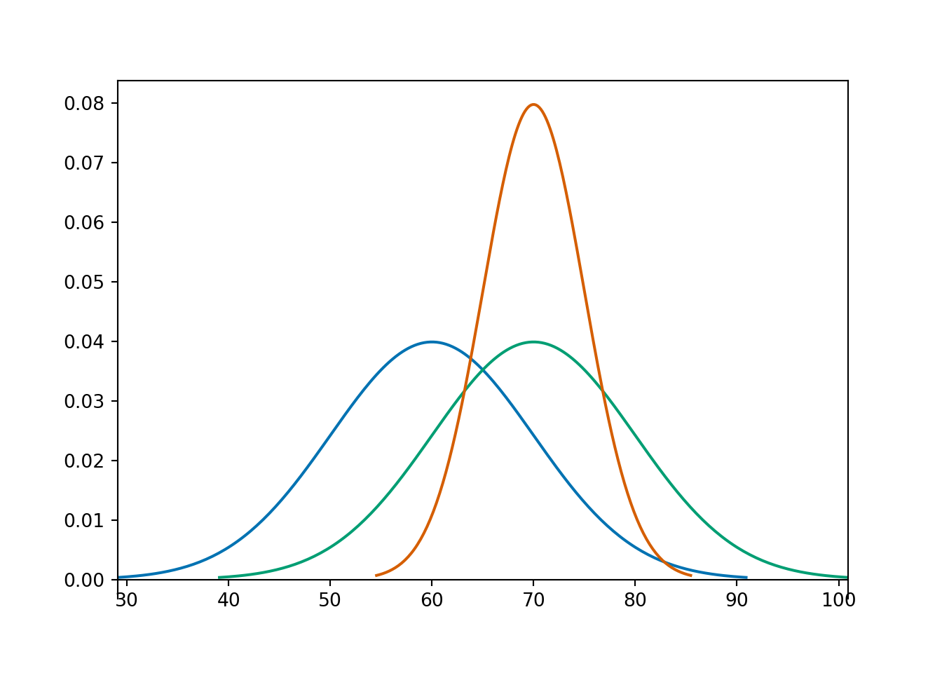 The pdfs in the plot below represent the distribution of hypothetical test scores in three classes. The test scores in each class follow a Normal distribution. Identify the mean and standard deviation for each class.