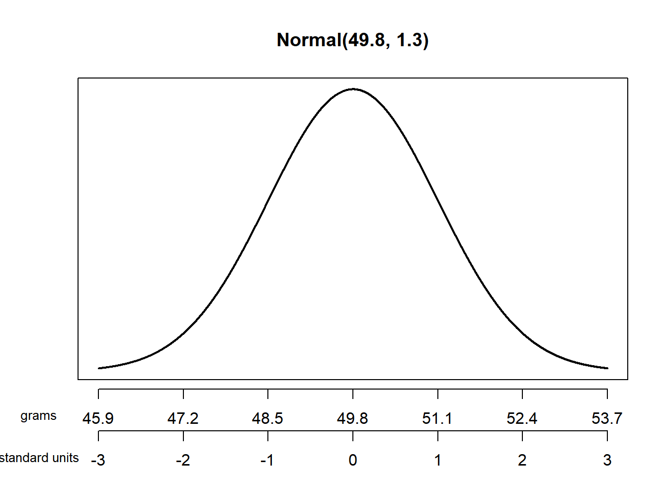 The wrapper of a package of candy lists a weight of 47.9 grams. Naturally, the weights of individual packages vary somewhat. Suppose package weights have an approximate Normal distribution with a mean of 49.8 grams and a standard deviation of 1.3 grams.