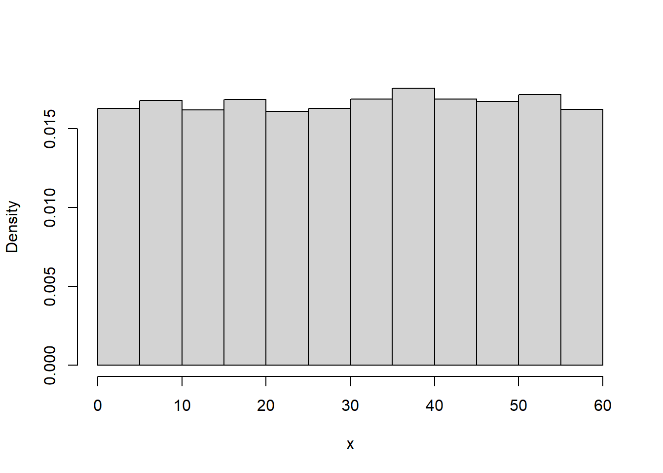hist).hist with freq = FALSE).Example 9.1 In the meeting problem assume that Regina’s arrival time \(X\) (minutes after noon) follows a Uniform(0, 60) distribution. Figure 9.1 displays a histogram of 10000 simulated values of \(X\).