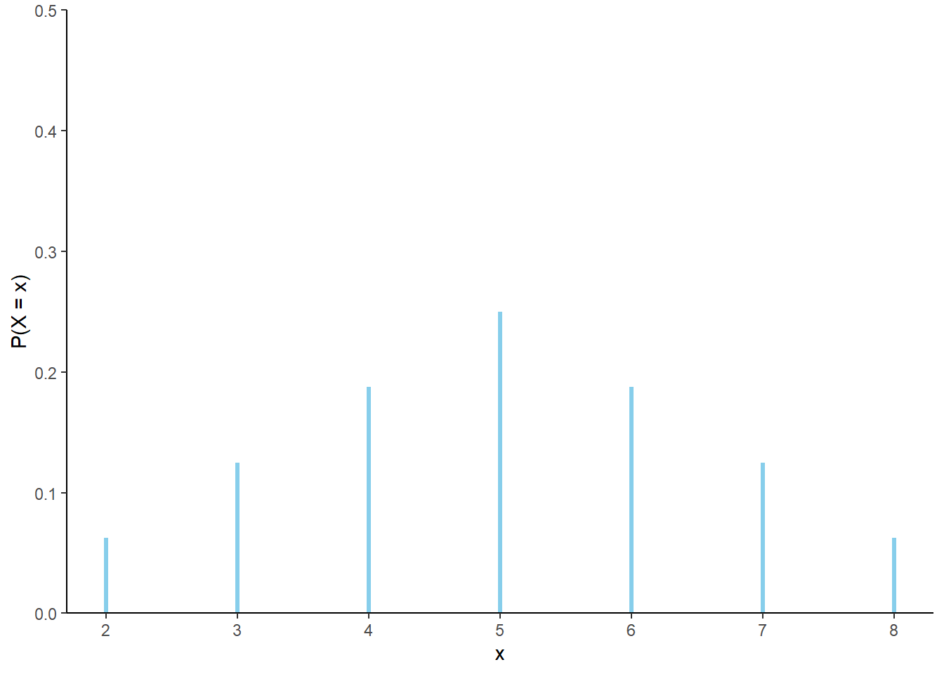 p_X(x) = \frac{4 - |x - 5|}{16}, \qquad x = 2, 3, \ldots, 8