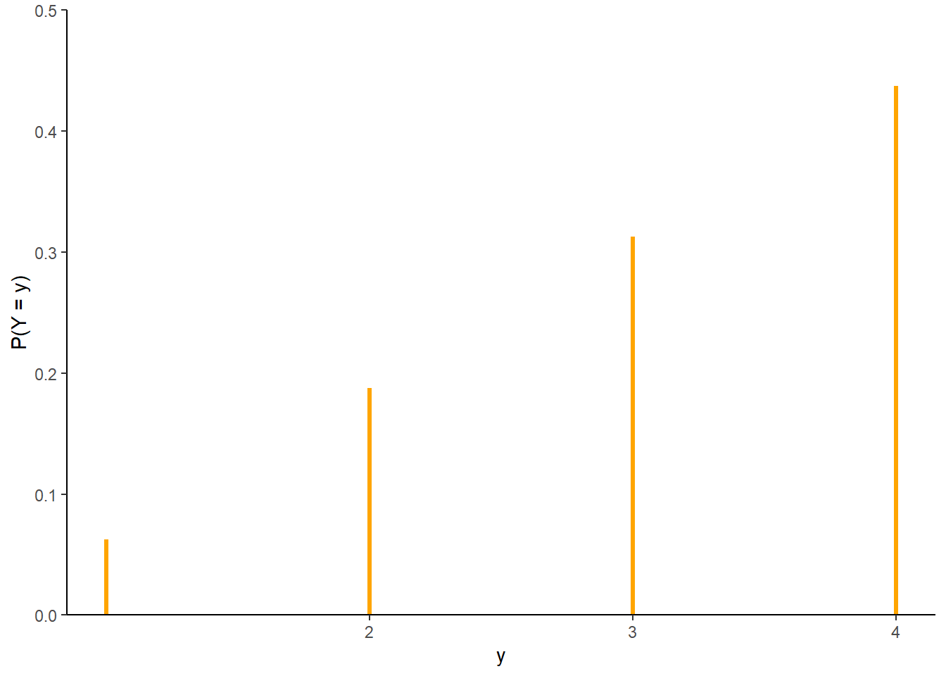 - Construct a table and plot of \(\text{P}(Y = y)\) for each possible value \(y\) of \(Y\).