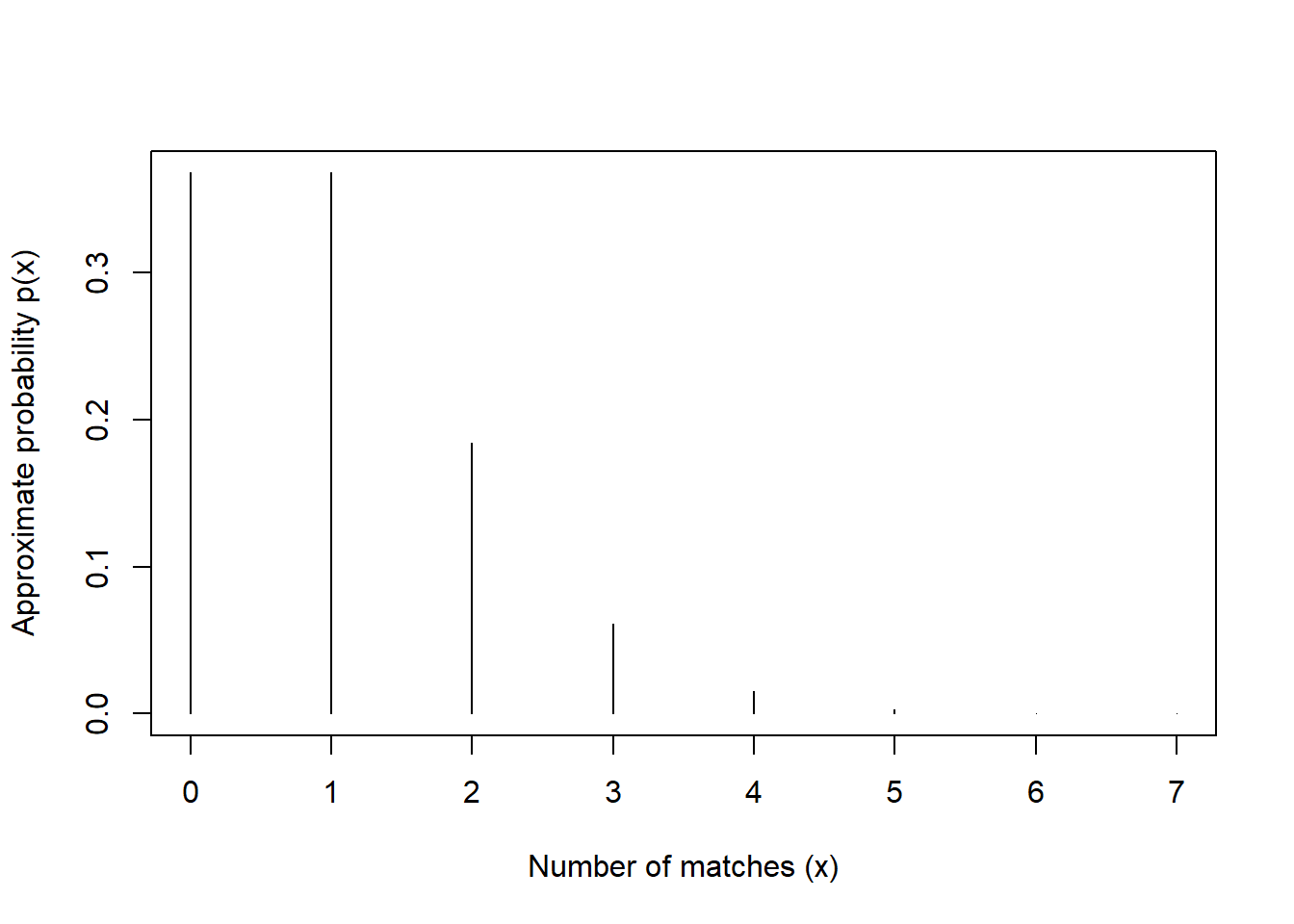 Example 5.5 Now consider the matching problem with general \(n\). Finding the distribution of \(X\) by enumerating the \(n!\) possible outcomes as we did for \(n=4\) is not feasible for general \(n\). But we can approximate the distribution of \(X\) with simulation. Simulation shows that the distribution of the number of matches \(X\) is approximately the same for all \(n\) (unless \(n\) is very small, i.e., \(n\le 5\)). In particular, for any \(n\), the probability mass function of \(X\) is approximately \[ p_X(x) = \frac{e^{-1}}{x!}, \qquad x = 0, 1, 2, \ldots \]