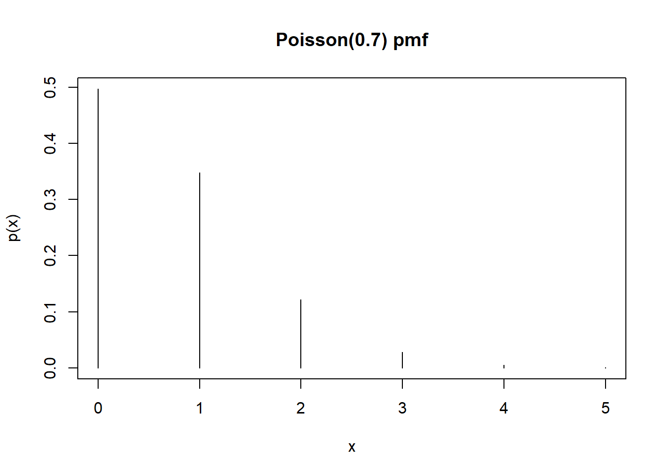 plot(x, px, type = "h", xlab = "x", ylab = "p(x)", main = "Poisson(0.7) pmf")