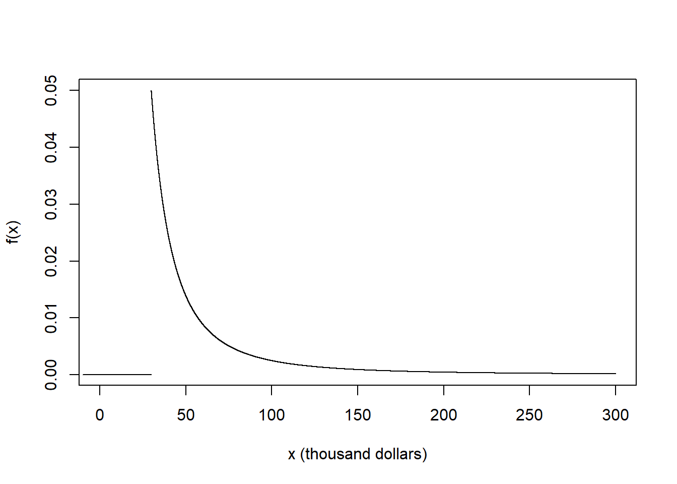 In a certain population, household income \(X\) ($ thousands) follows the pdf \[ f_X(x) = c x^{-2.5}, \quad x \ge 30 \] for an appropriate constant \(c\). Note that the measurement units are $ thousands, so 1 represents 1 thousand dollars.