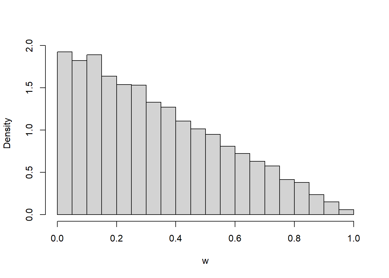 - Coding required. Code and run a simulation to approximate the distribution of \(W\). Does the histogram reasonably match up with the pdf? Then use the simulation results to approximate \(\text{P}(W < 0.25)\).