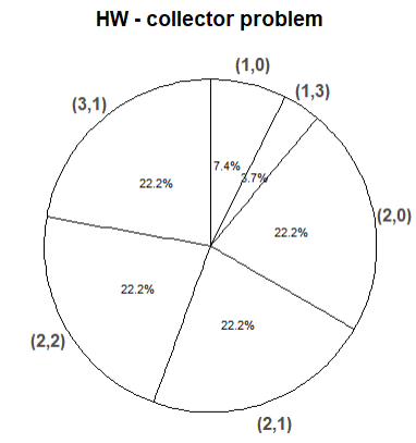 \(y\) \(x\) 0 1 2 3 Total 1 2/27 0 0 1/27 3/27 2 6/27 6/27 6/27 0 18/27 3 0 6/27 0 0 6/27 Total 8/27 12/27 6/27 1/27 1 Make a tile plot with color or shading representing probability; see below.