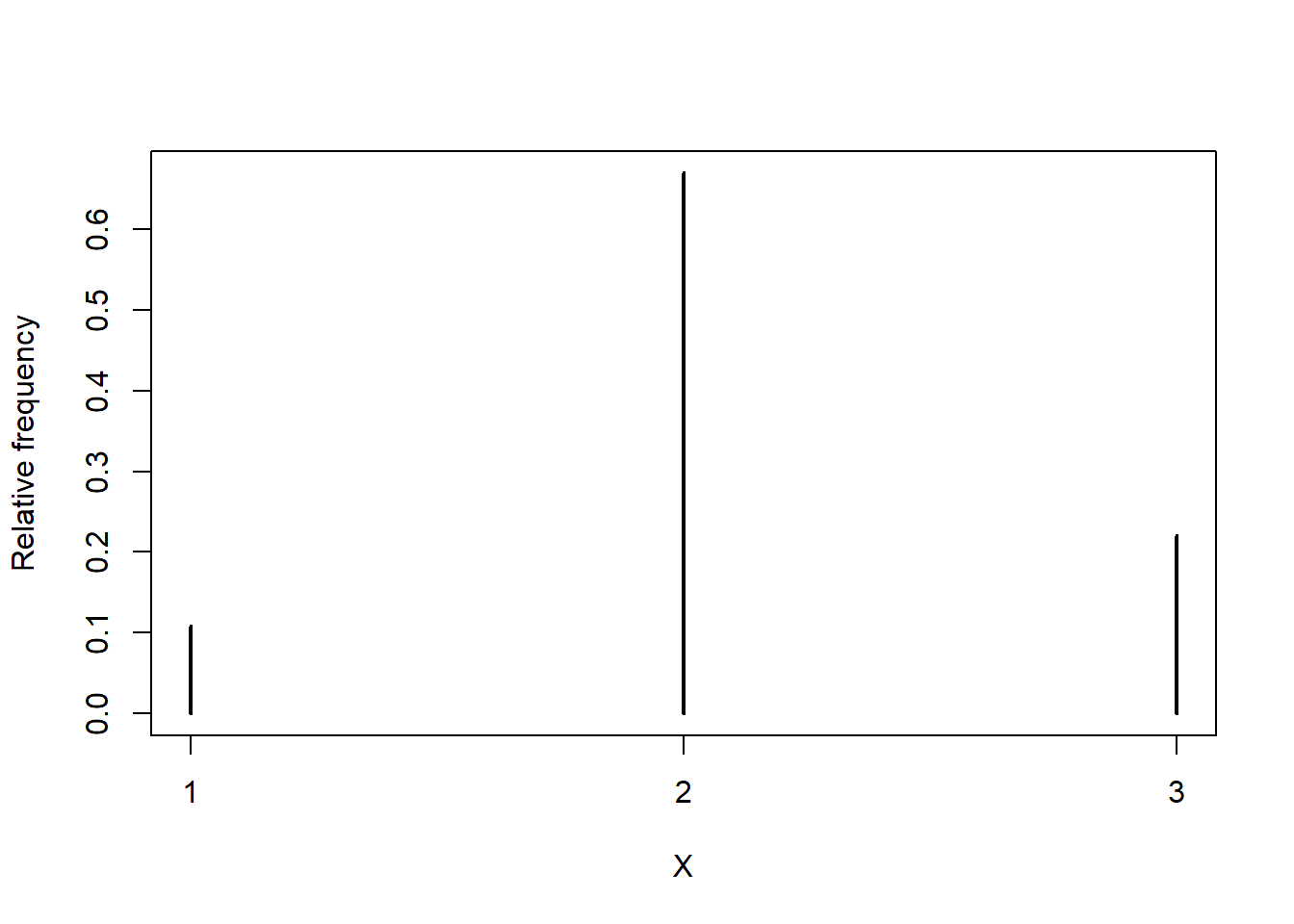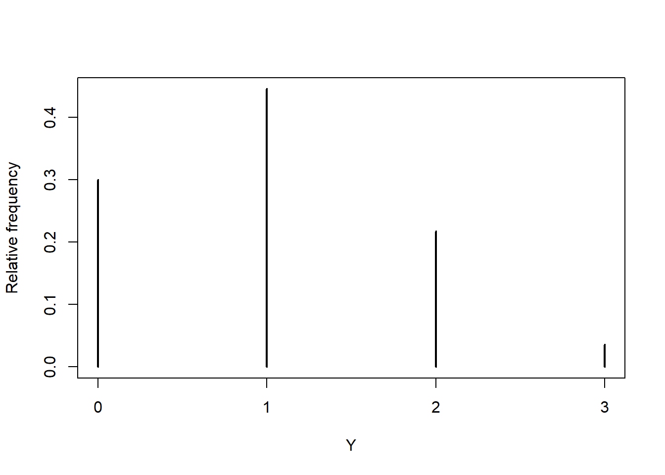 - \(\text{P}(X = 3)\). Simulate many values of \(X\), count the number of simulated values equal to 3, and divide by the number of simulated values (i.e., find the simulated relative frequency of 3)