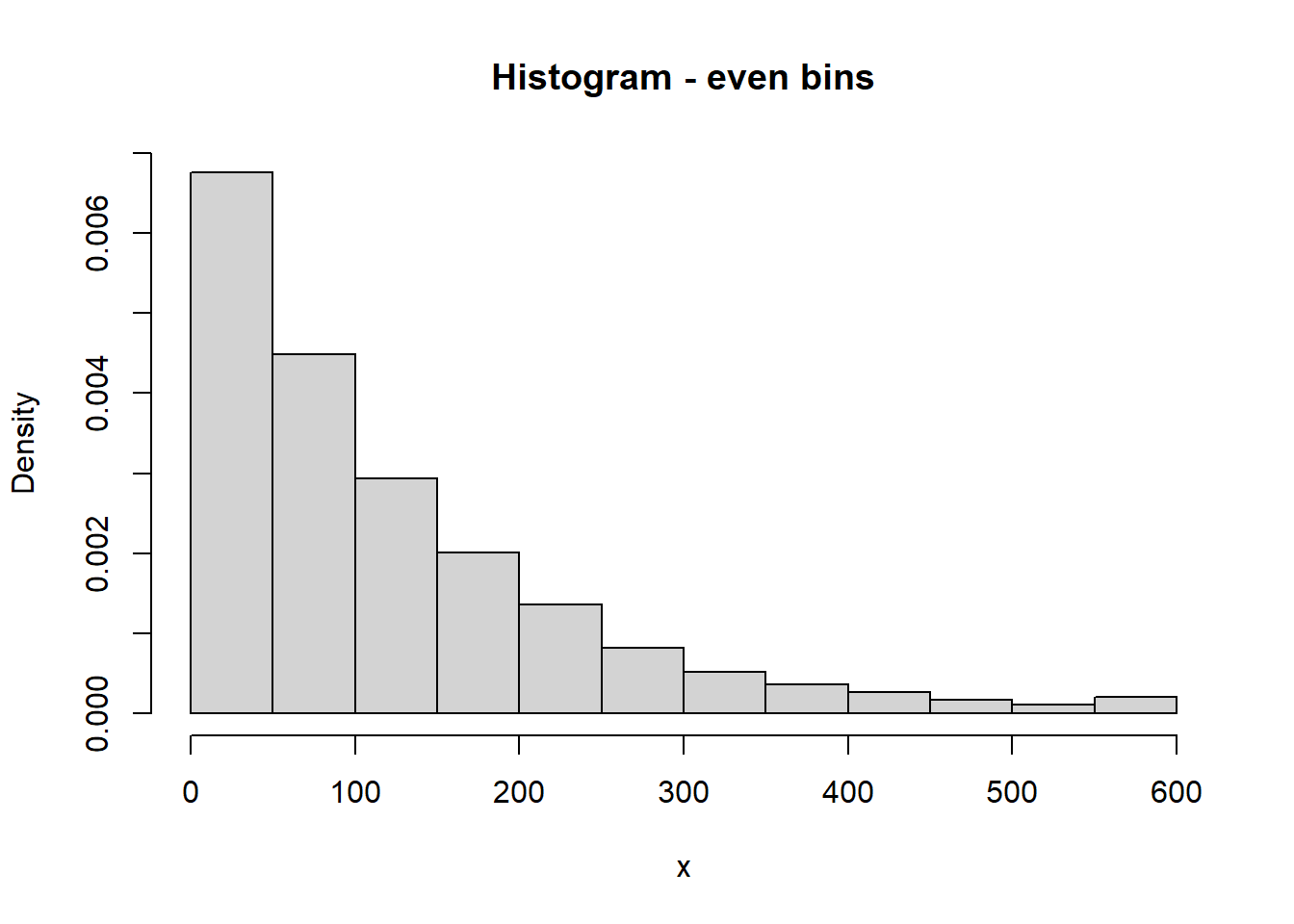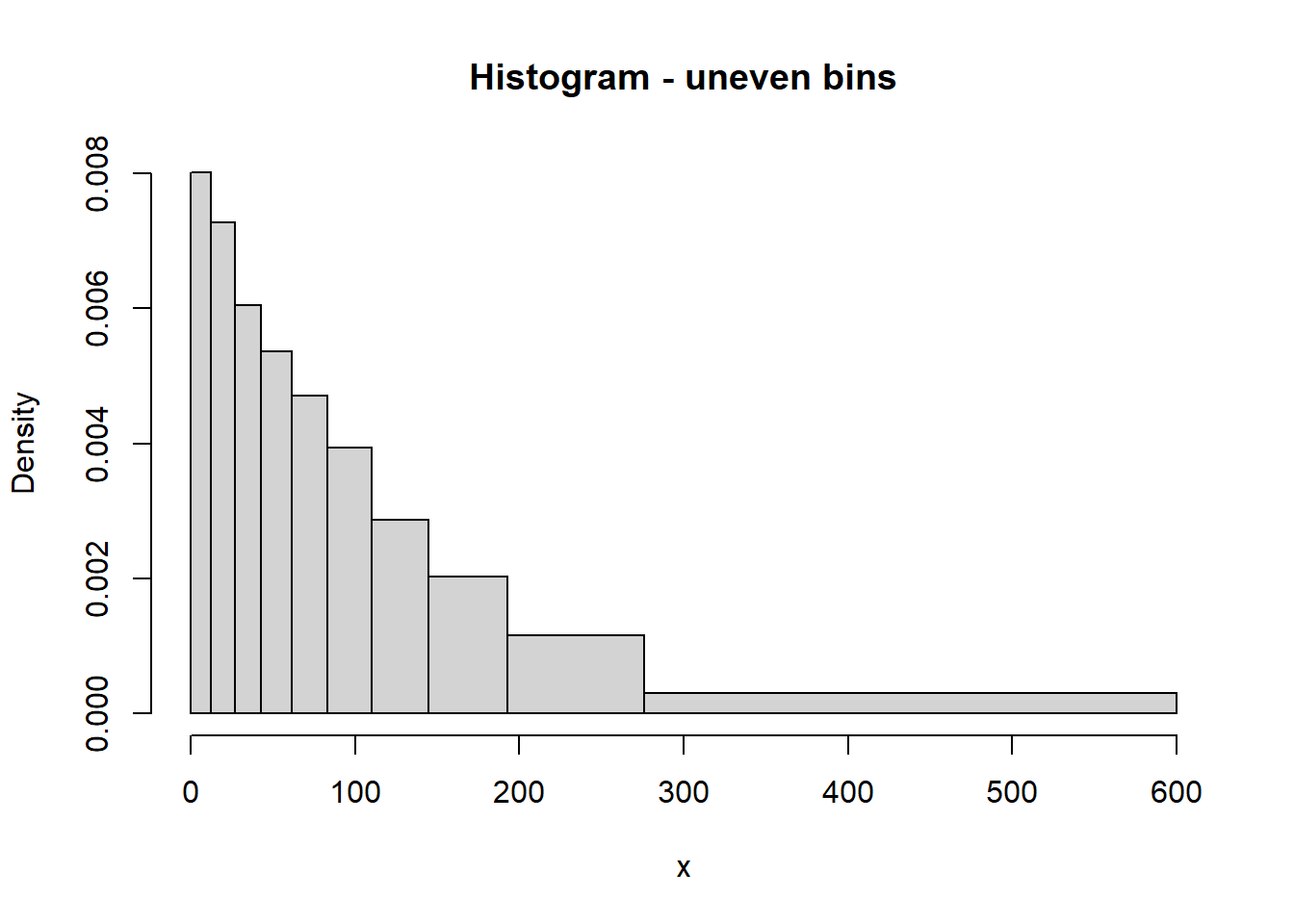 - We always end with a histogram with even bins, but sometimes it helps to start sketching a histogram with unever bins. We know that 10% of the values are between 0 and 12.6, 10% are between 12.6 and 26.8, 10% are between 26.8 and 42.8, etc. So if we split the bins of the histogram based on these percentiles, each bin would correspond to a relative frequency of 10%. HOWEVER, AREA in a histogram represents relative frequency. So each of the bins would have the same area, but they are unequally spaced, so they would not have the same height. For example, the first bin has area of 10% over a base of (0, 12.6), while the 80-90 percentile bin has area 10% spread over the interval (193.1, 276.3), so the bar for (193.1, 276.3) will have a smaller height than the bar for (0, 12.6). Sketching a histogram with these unevenly spaced bins first gives an idea of the shape; then you can sketch a histogram with a similar shape but equally spaced bins. We can see that density is highest near 0 and decreases as \(x\) increases; notice the stretching and shrinking on the spinner. (The highest percentile is the 90th, so we don’t know what the upper bound is that almost all values fall below.)