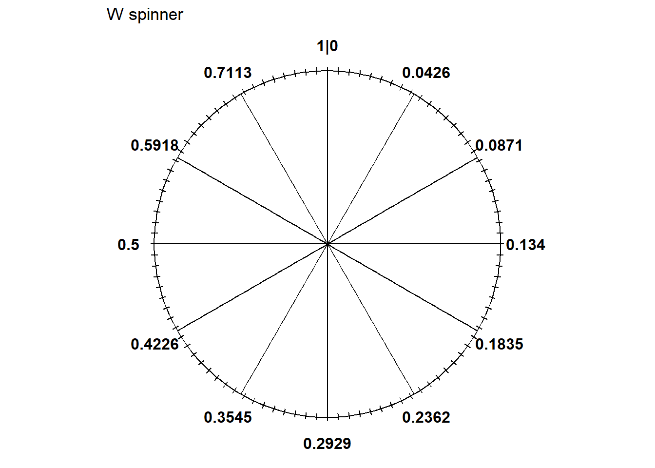 - Notice that the values around the spinner are unequally spaced. The density of \(W\) is higher near 0 so intervals near 0 are stretched out; the density of \(W\) is lower near 1 so intervals near 1 are shrunk.