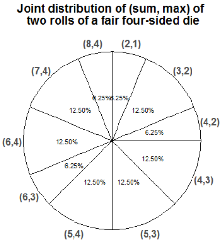 Example 12.1 Roll a fair four-sided die twice. Let \(X\) be the sum of the two dice, and let \(Y\) be the larger of the two rolls (or the common value if both rolls are the same). Recall Table 5.1.