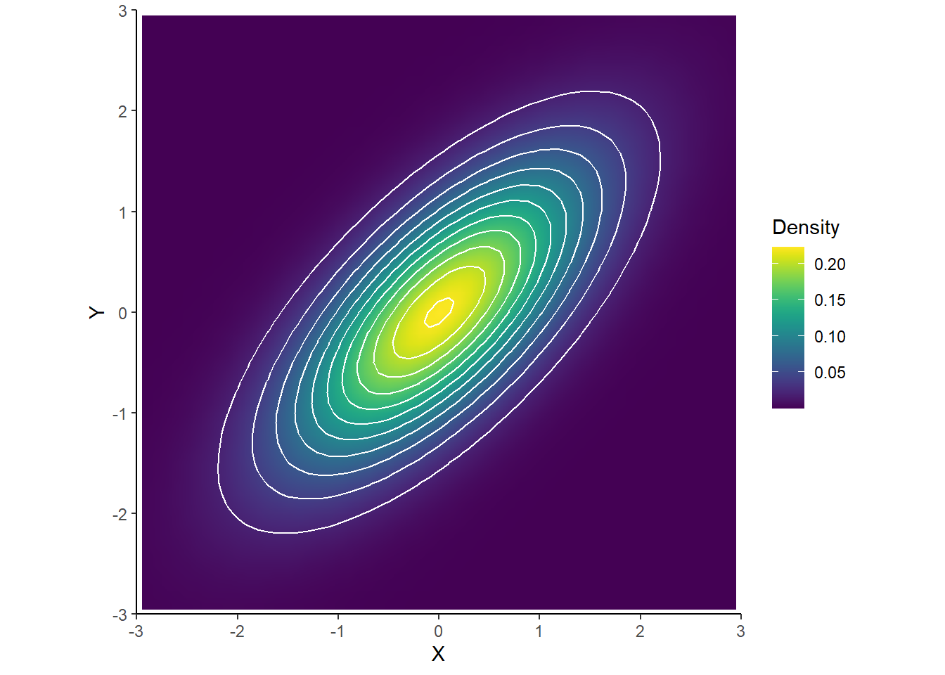 - A Bivariate Normal Density has elliptical contours. For each height \(c>0\) the set \(\{(x,y): f_{X, Y}(x,y)=c\}\) is an ellipse. The density decreases as \((x, y)\) moves away from \((\mu_X, \mu_Y)\), most steeply along the minor axis of the ellipse, and least steeply along the major of the ellipse.