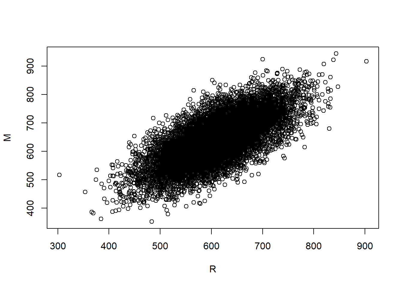 M = rnorm(N_rep, 640 + 0.7 * 80 * (R - 610) / 70, 80 * sqrt(1 - 0.7 ^ 2))
