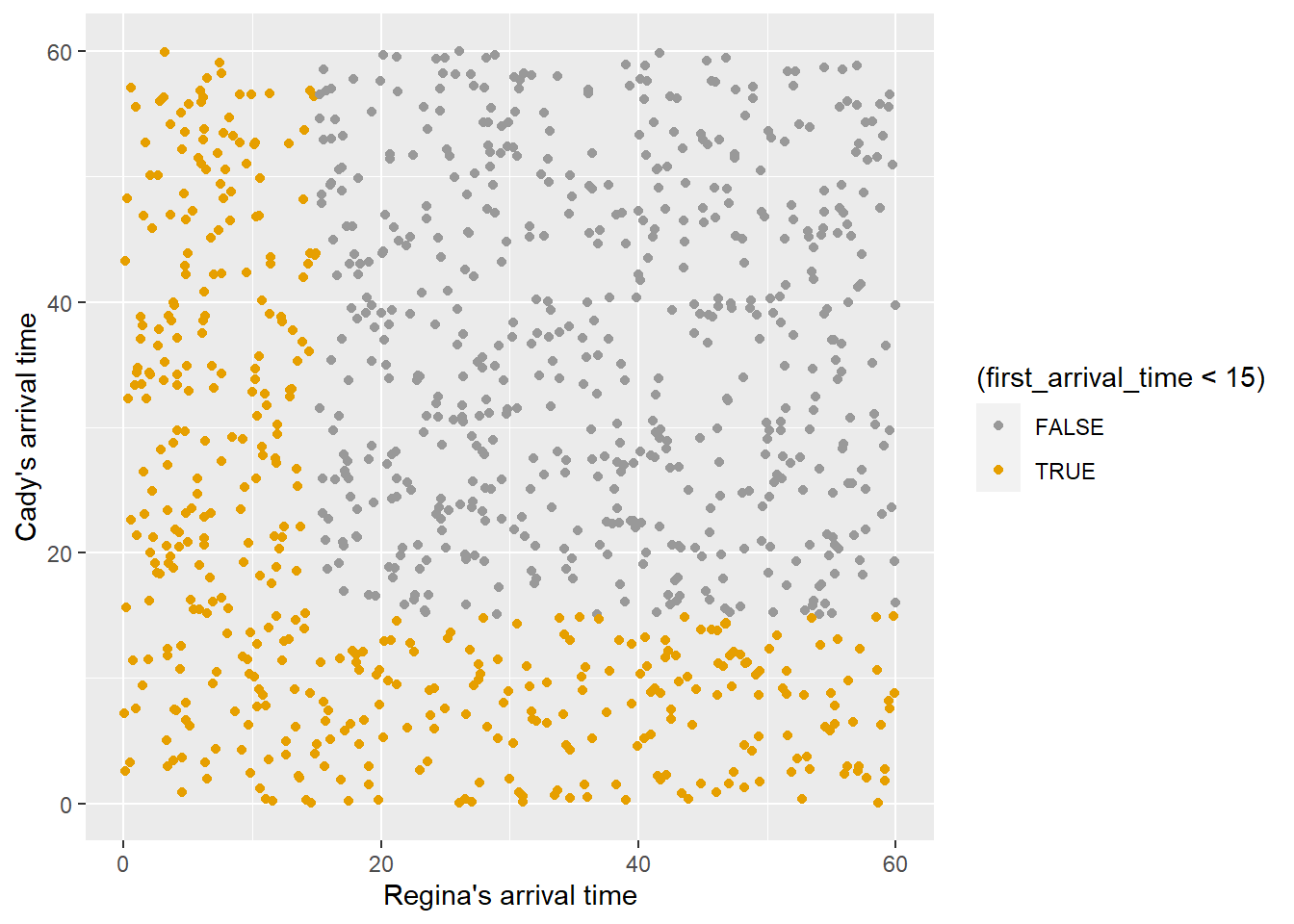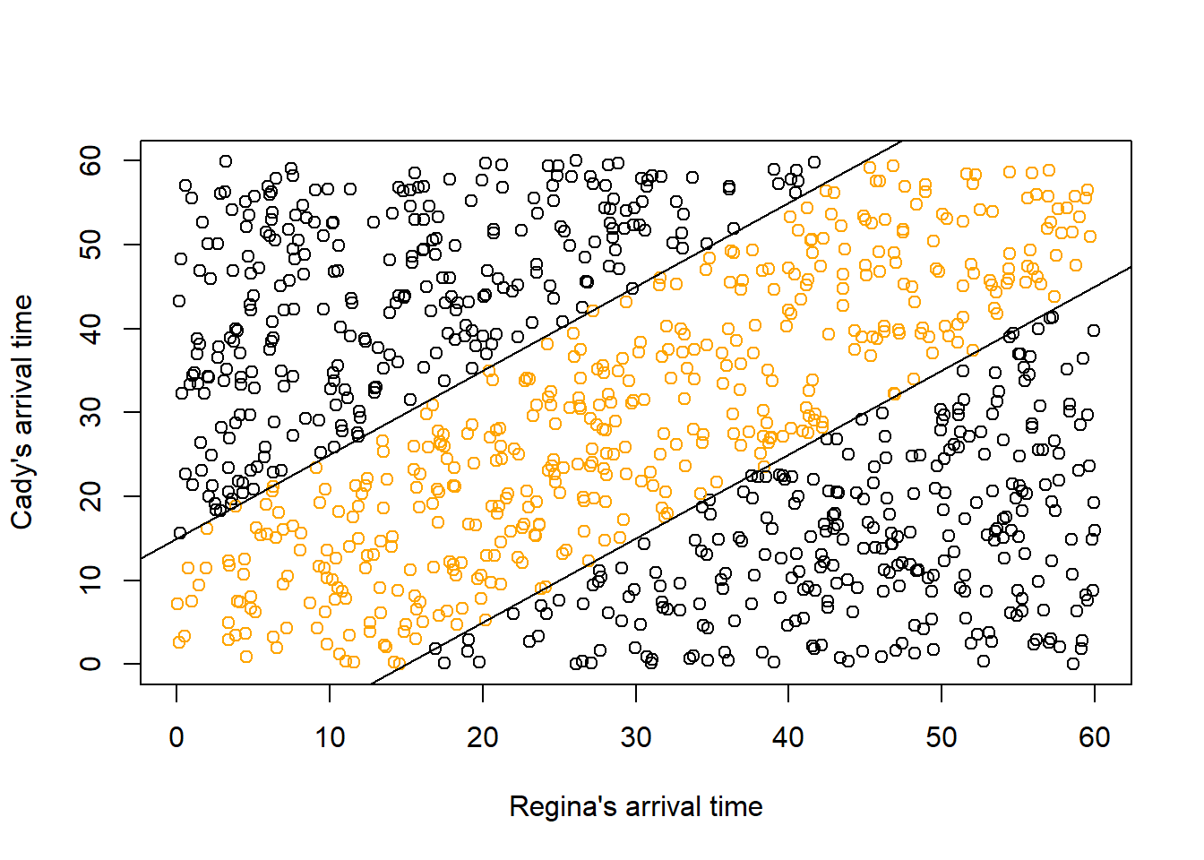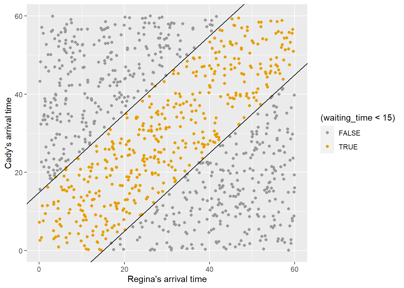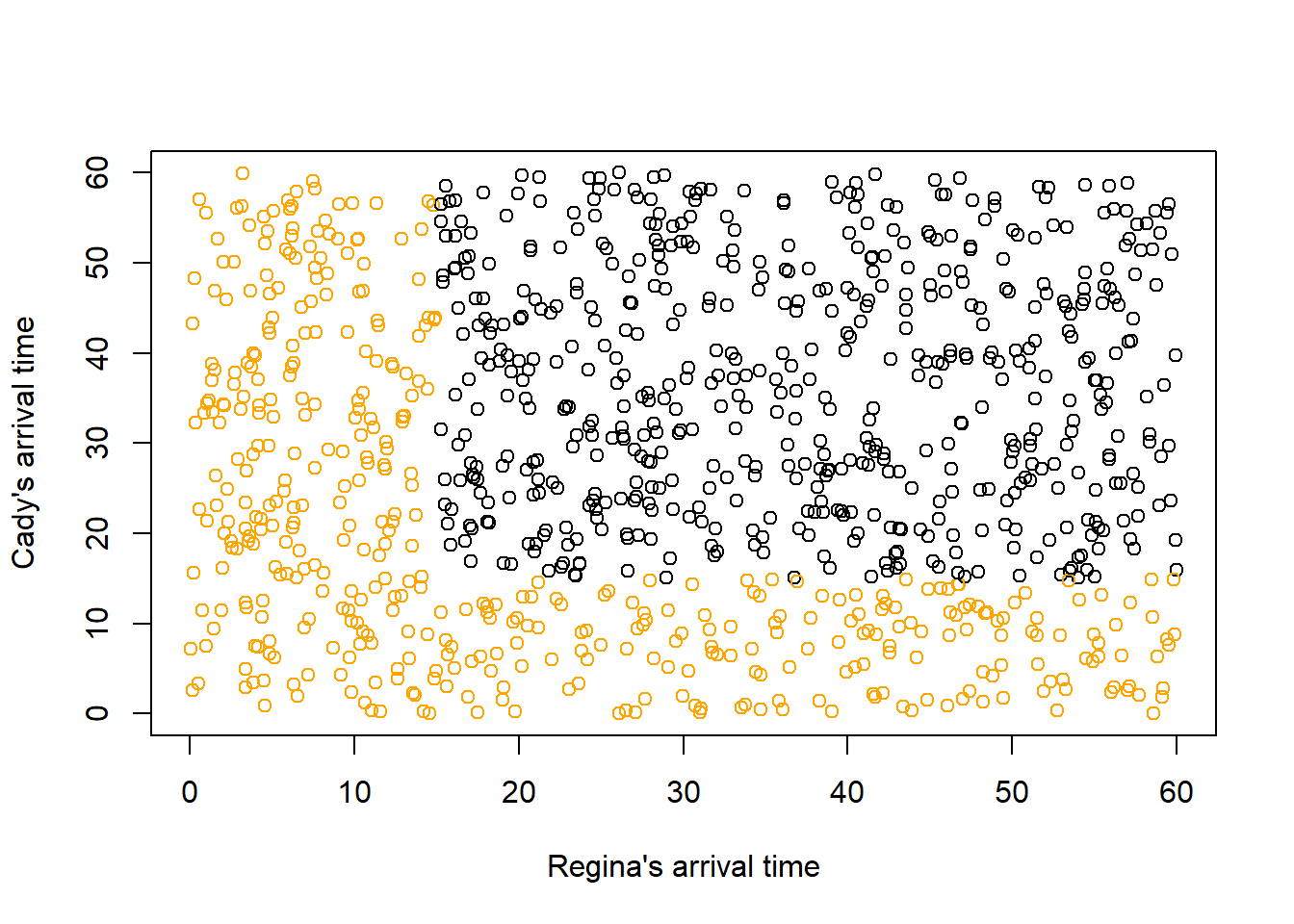 Example 2.3 Regina and Cady are meeting for lunch. Suppose they each arrive uniformly at random at a time between noon and 1:00, independently of each other. Record their arrival times as minutes after noon, so noon corresponds to 0 and 1:00 to 60.