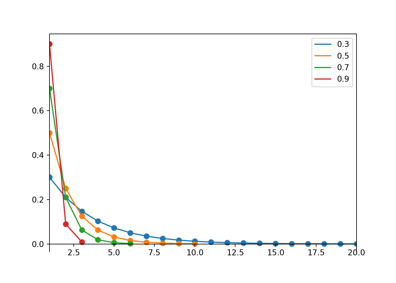 | 7 | \(0.4(1-0.4)^{7-1}\) | 0.019 |
