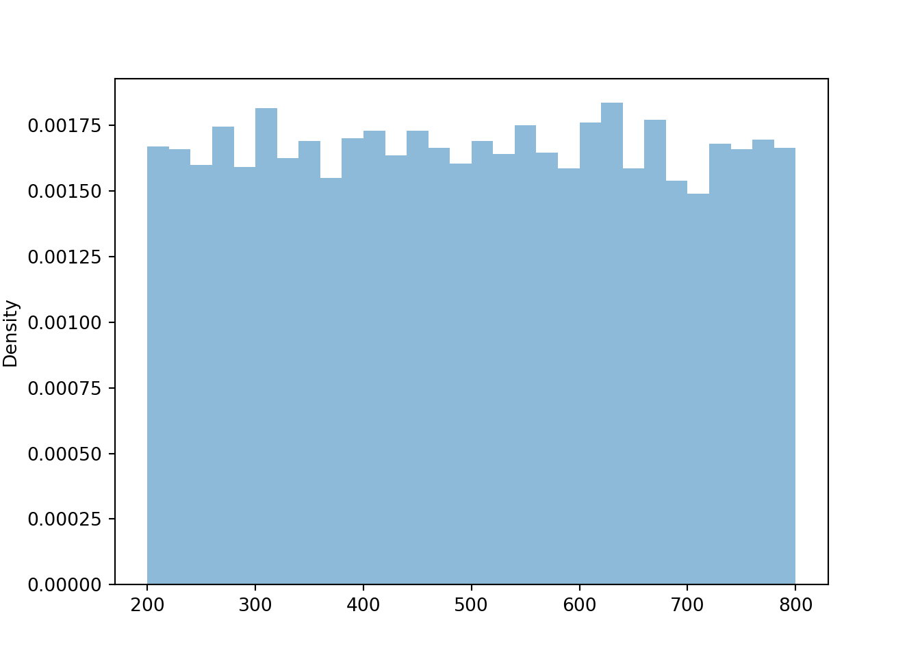 Suppose that SAT Math score \(X\) follows a Uniform(200, 800) distribution. (It doesn’t but go with in for now). One way to simulate values of \(X\) is to simulate values of \(U\) from a Uniform(0, 1) distribution and let \(X = 200 + (800 - 200)U= 200 + 600U\). Then \(X\) is a linear rescaling of \(U\), and \(X\) takes values in the interval [200, 800]. We can define and simulate values of \(X\) in Symbulate. Before looking at the results, sketch a plot of the distribution of \(X\) and make an educated guess for its mean and standard deviation.