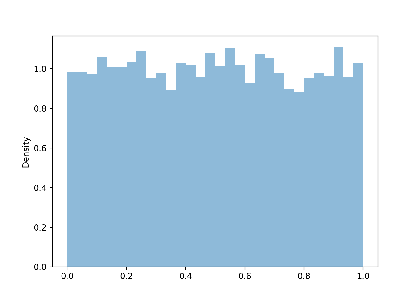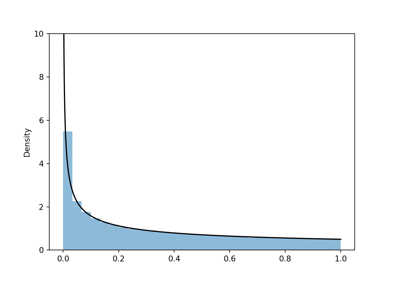 See the simulation results below. We see that the density is highest near 0 and lowest near 1.