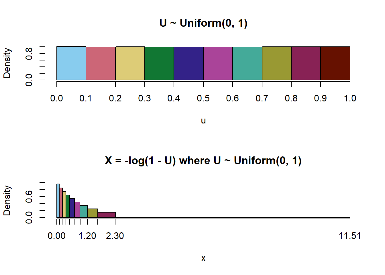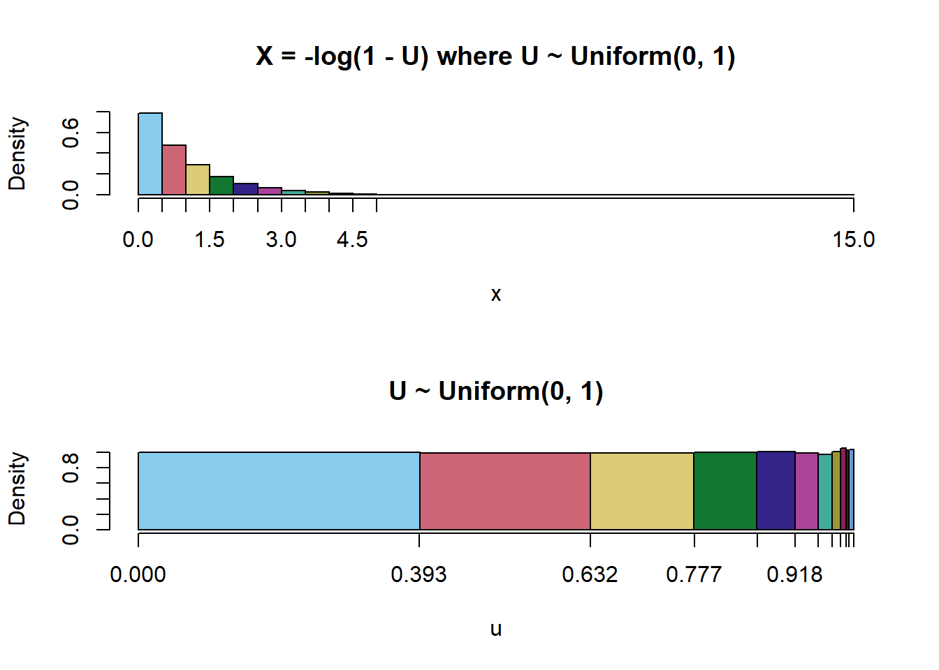 The corresponding \(U\) intervals are obtained by applying the inverse transformation \(v\mapsto 1-e^{-v}\). For example, the \(X\) interval \((0.5, 1)\) corresponds to the \(U\) interval \((1-e^{-0.5}, 1-e^{-1}) = (0.393, 0.632)\).