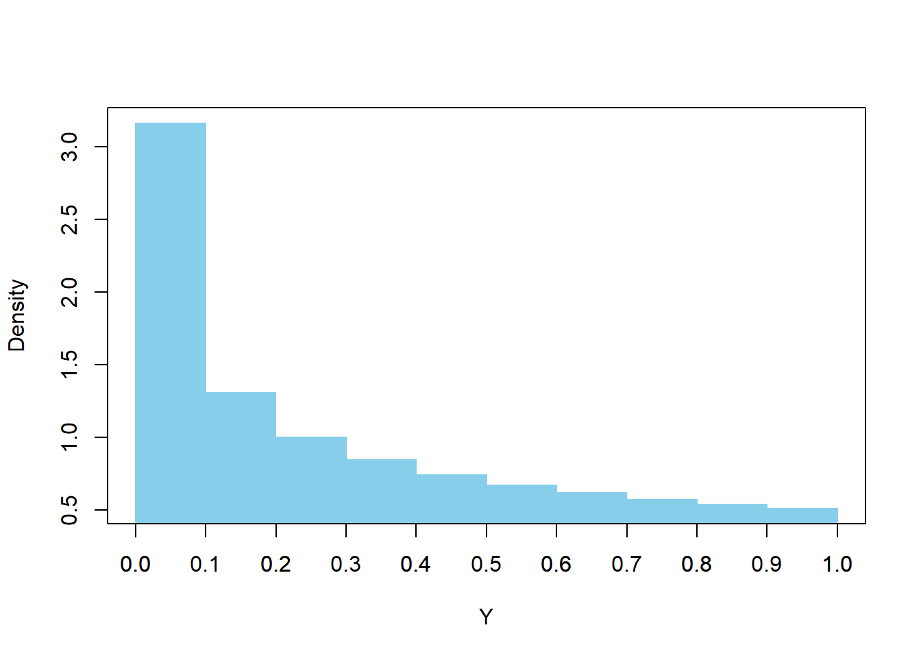 - Use the cdf method to find the pdf of \(Y\). Is the pdf consistent with your simulation results?