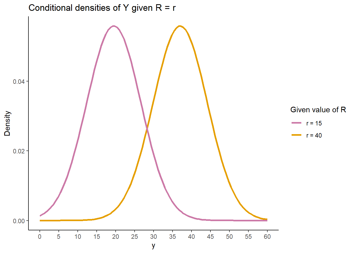 - Suppose the simulated value of \(R\) is 40. What is the distribution that we want to simulate the corresponding \(Y\) value from?