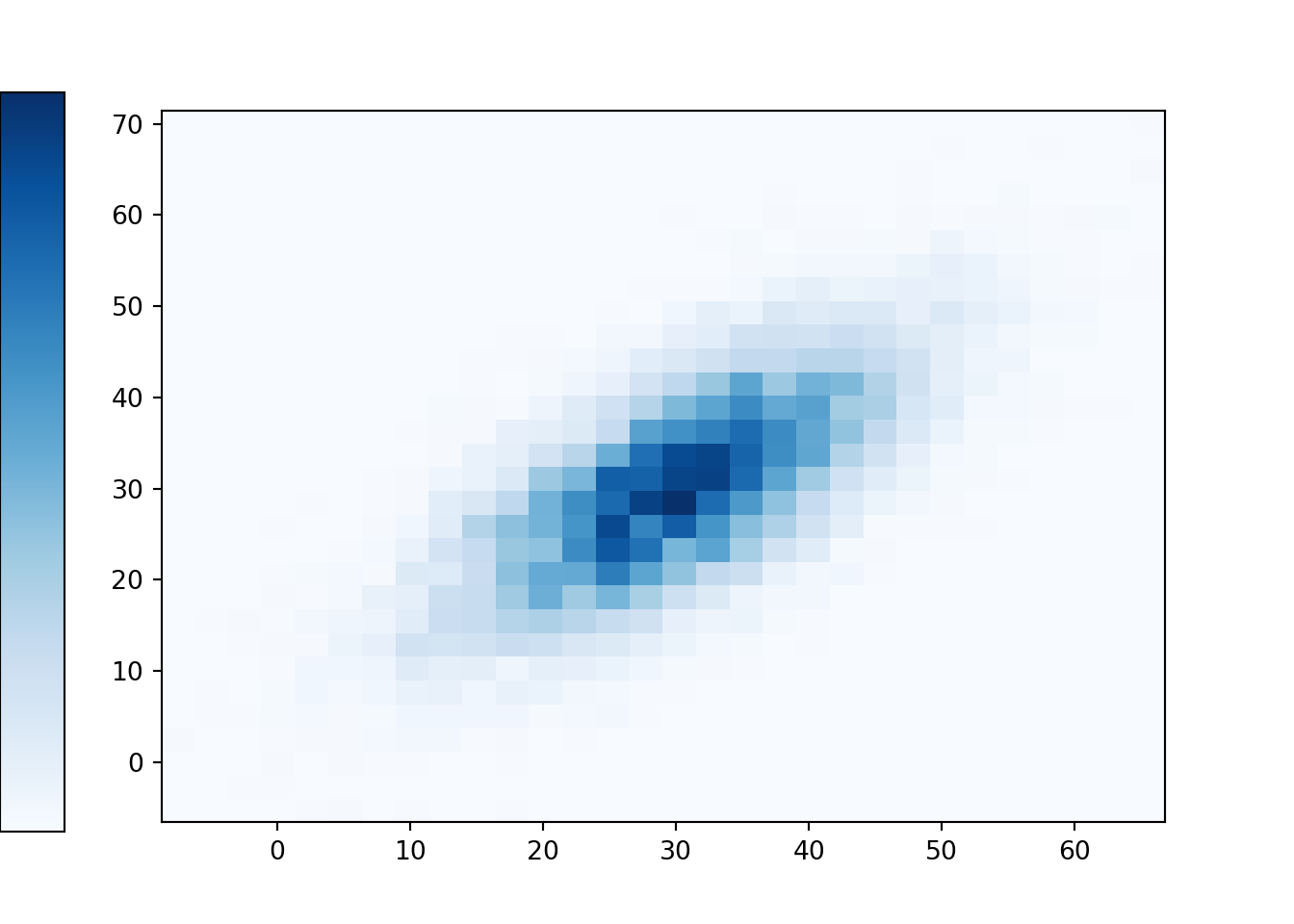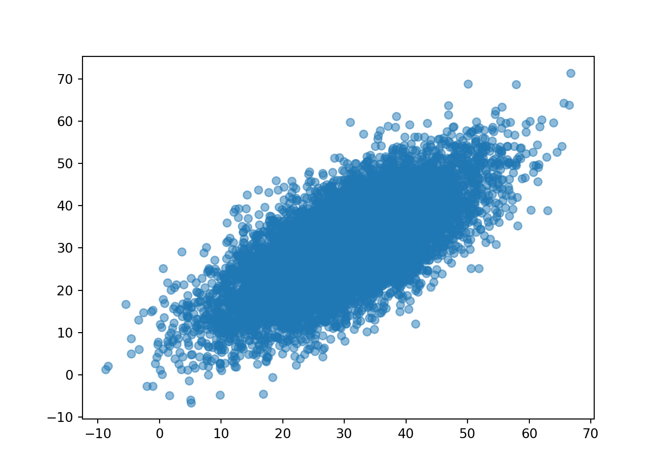 R, Y = RV(BivariateNormal(mean1 = 30, sd1 = 10, mean2 = 30, sd2 = 10, corr = 0.7))